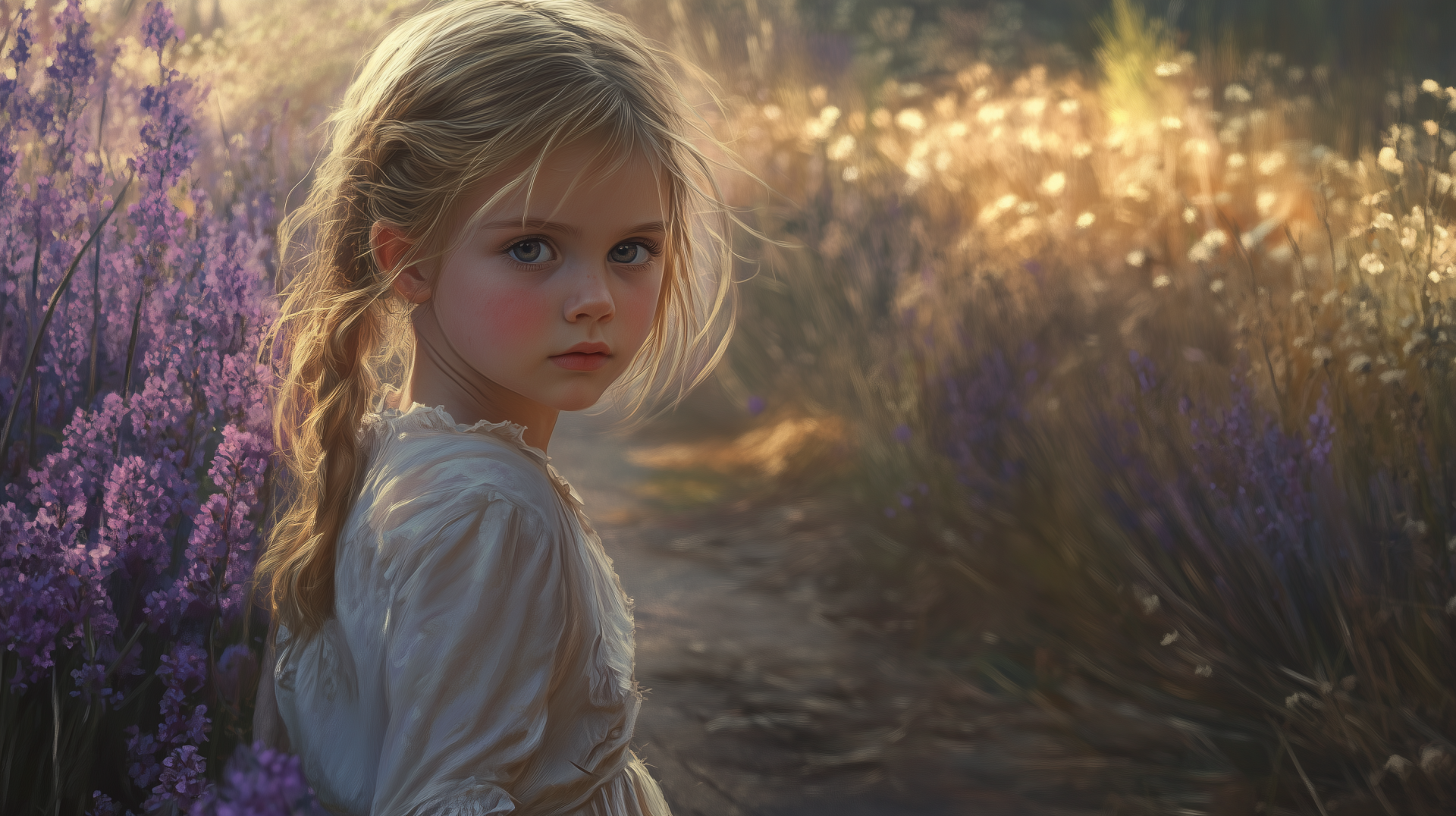A young girl with light hair wanders aimlessly along a dirt road, her clothing appears worn and disheveled. Lilac flowers bloom nearby, adding a touch of color to the rustic atmosphere.