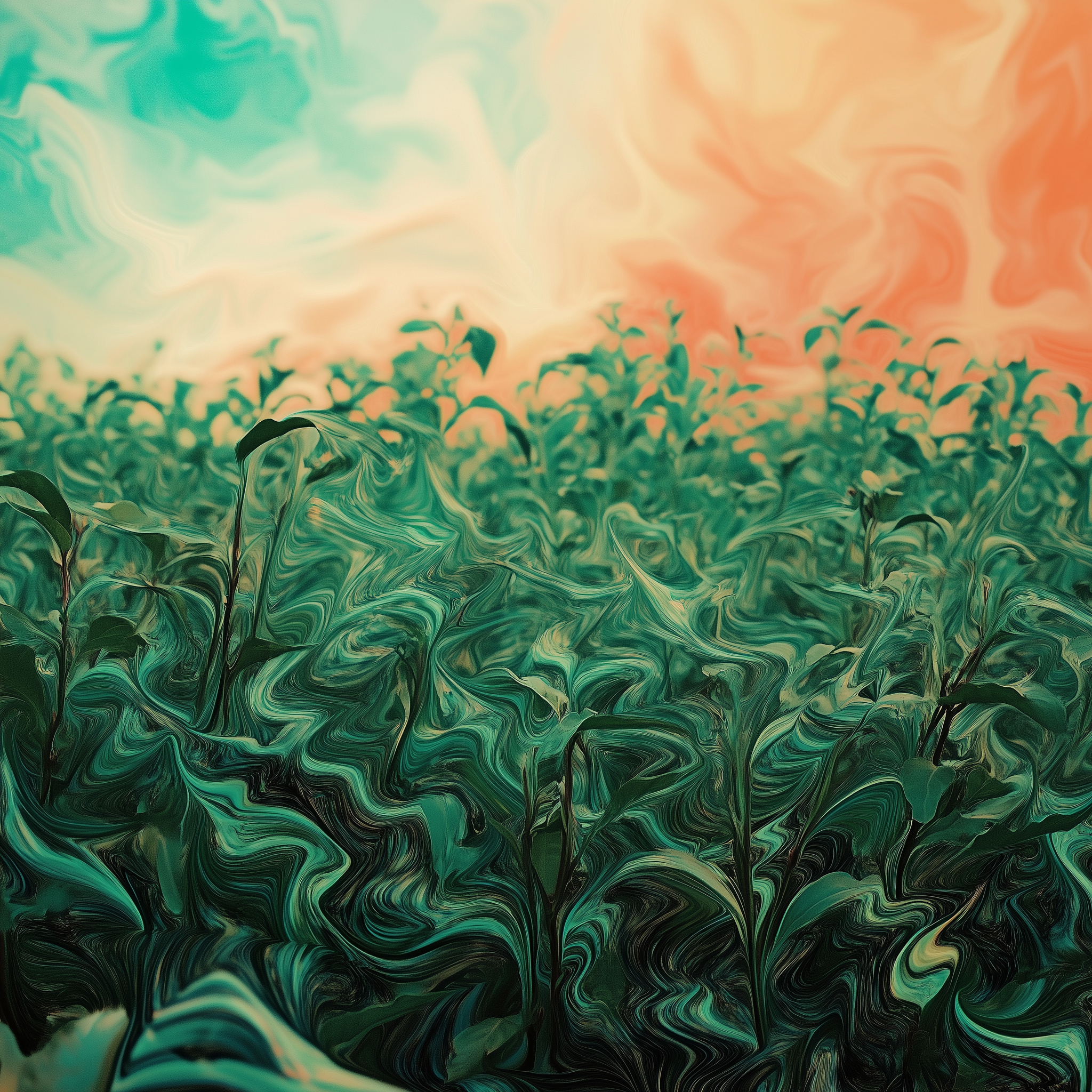 This photo captures a vivid field of green mint, infused with swirling colors and abstract shapes. The overall effect resembles a mesmerizing hallucination, inviting viewers into a dreamlike experience.
