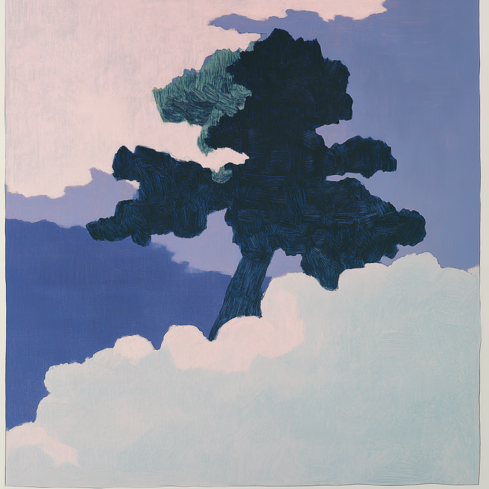 This illustration features a fantastical scene set amidst a vast expanse of clouds, enveloped by a dense and heavy mist. The minimalist style enhances the ethereal quality of the landscape, creating a serene and dreamlike atmosphere.