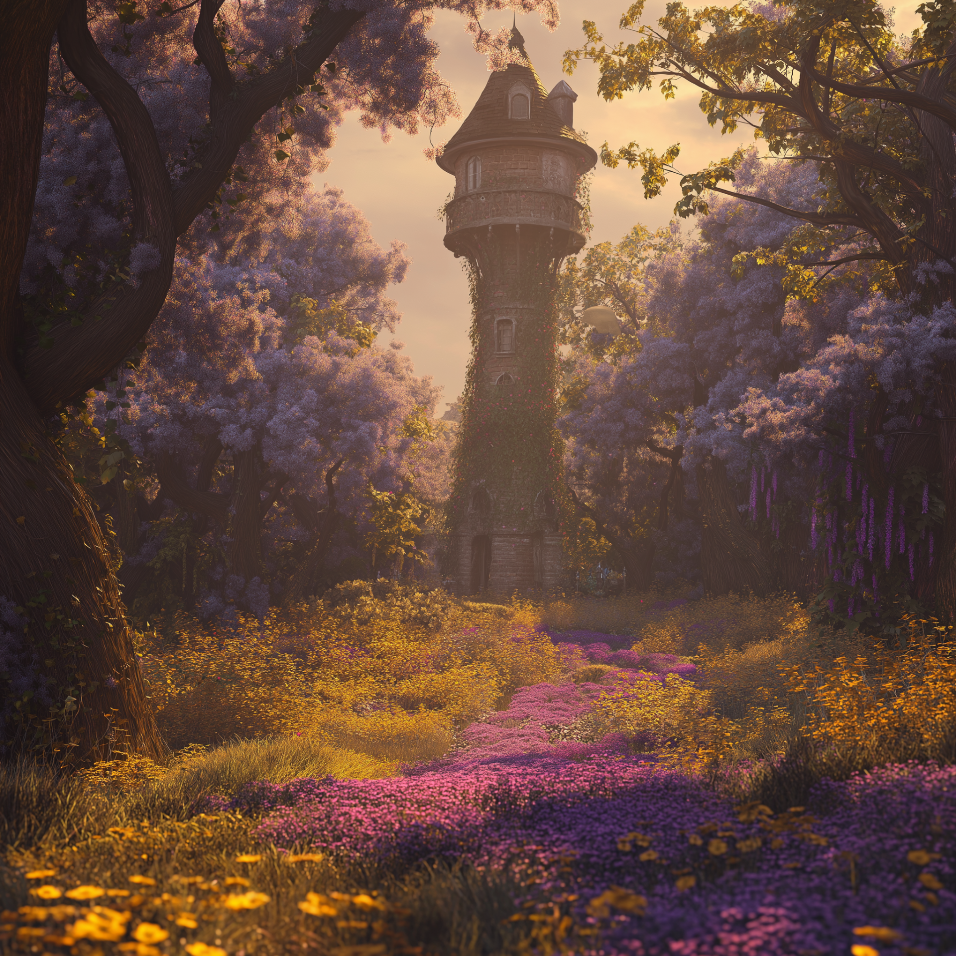 This image showcases a magical forest filled with vibrant lilac, golden, and purple flowers. In the background, an old Rapunzel tower rises amid the lush scenery, creating a whimsical and fairy-tale atmosphere.