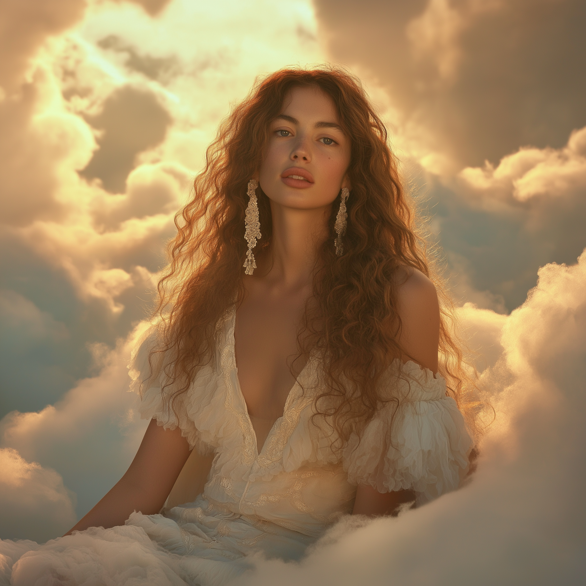 The image portrays a beautiful model enveloped by fluffy clouds, creating a serene and dreamy atmosphere. Soft golden hour lighting enhances the romantic mood of the scene, accentuating the model's features and elegant attire.