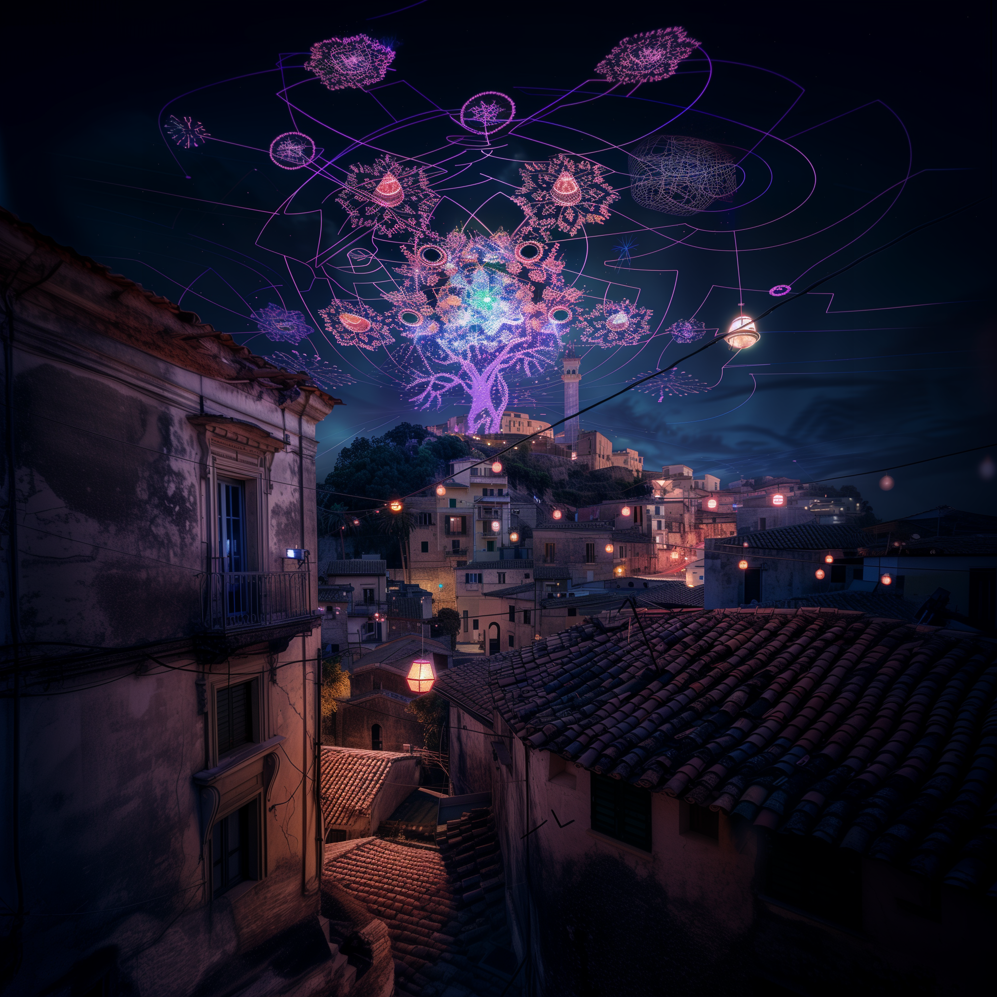 The image features a vibrant rooftop platform overlooking the ethno-cultural backdrop of Matera city. A mesmerizing array of LSD-inspired colors and dreamlike streetlights create a surreal night atmosphere, enhanced by a psychedelic sky filled with symbols.