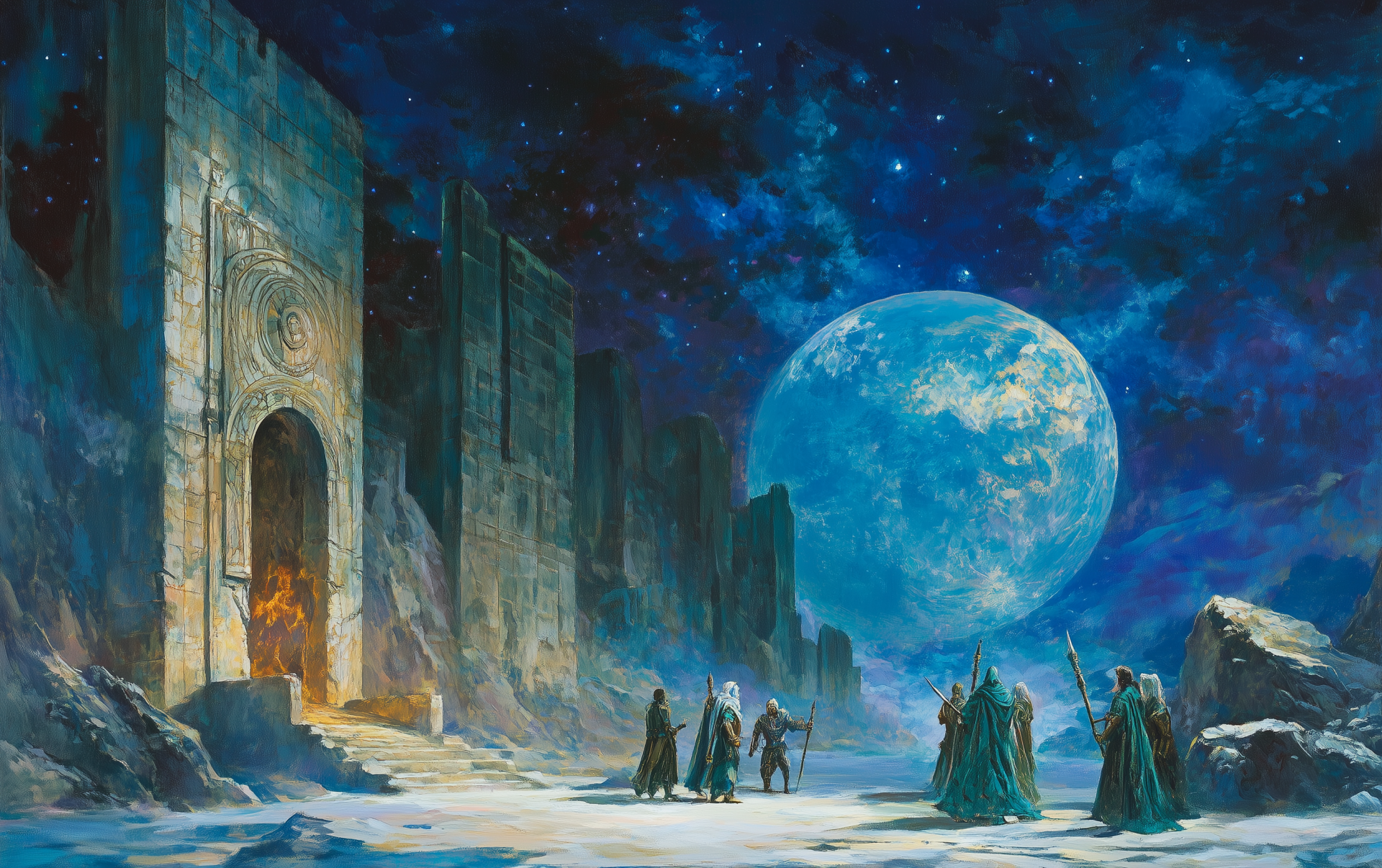 This image depicts a mystical and ethereal scene where multiple figures are gathered in a trance-like state, surrounded by swirling visions of vibrant colors and otherworldly landscapes. A mysterious blue curtain looms in the background, suggesting the promise of new worlds beyond the veil of reality.