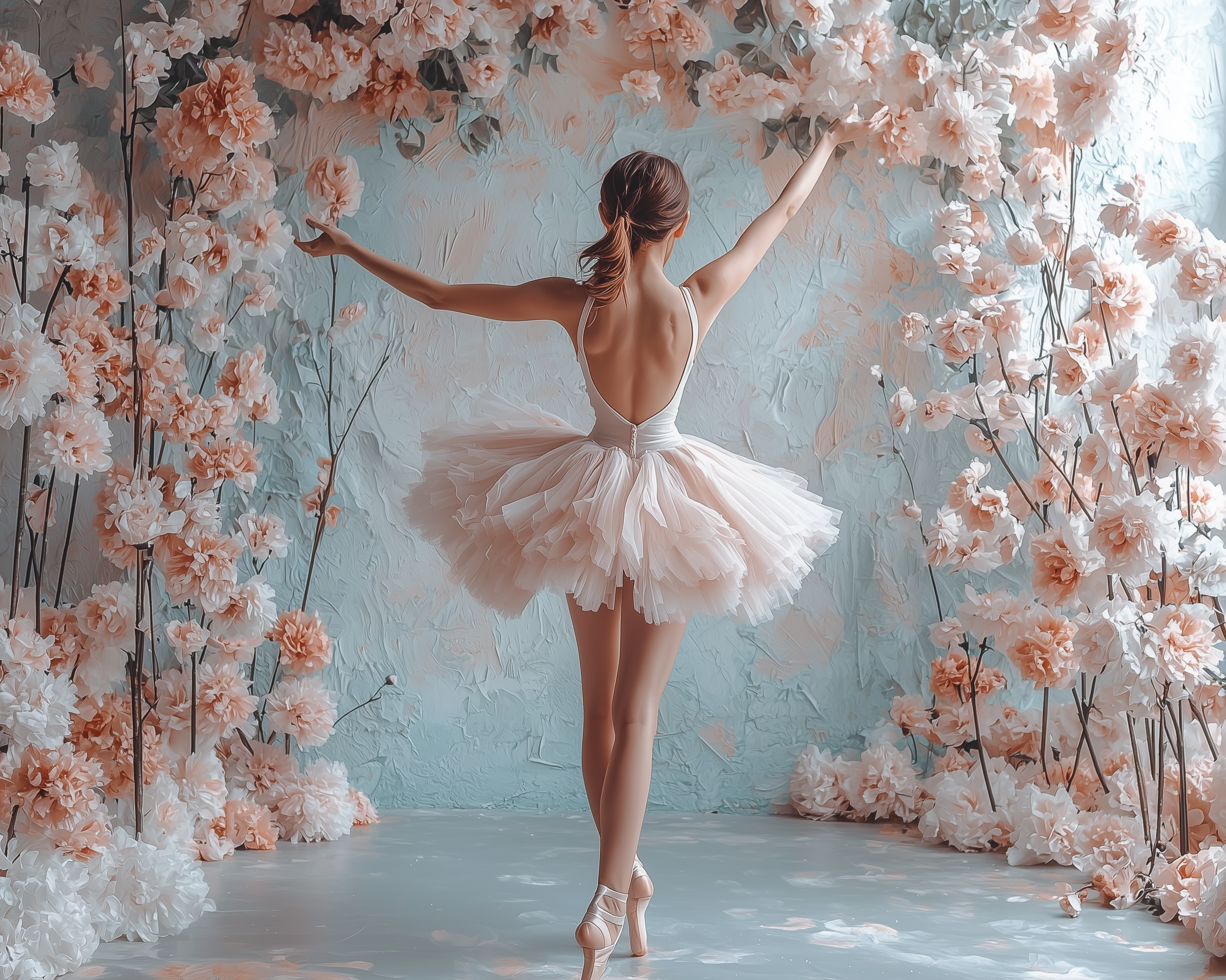 This image captures a photography studio space adorned with vintage decor, emphasizing a dreamy atmosphere. The soft light and textured walls create a picturesque setting for a ballet dancer, with a serene color palette of almond and pale pink.