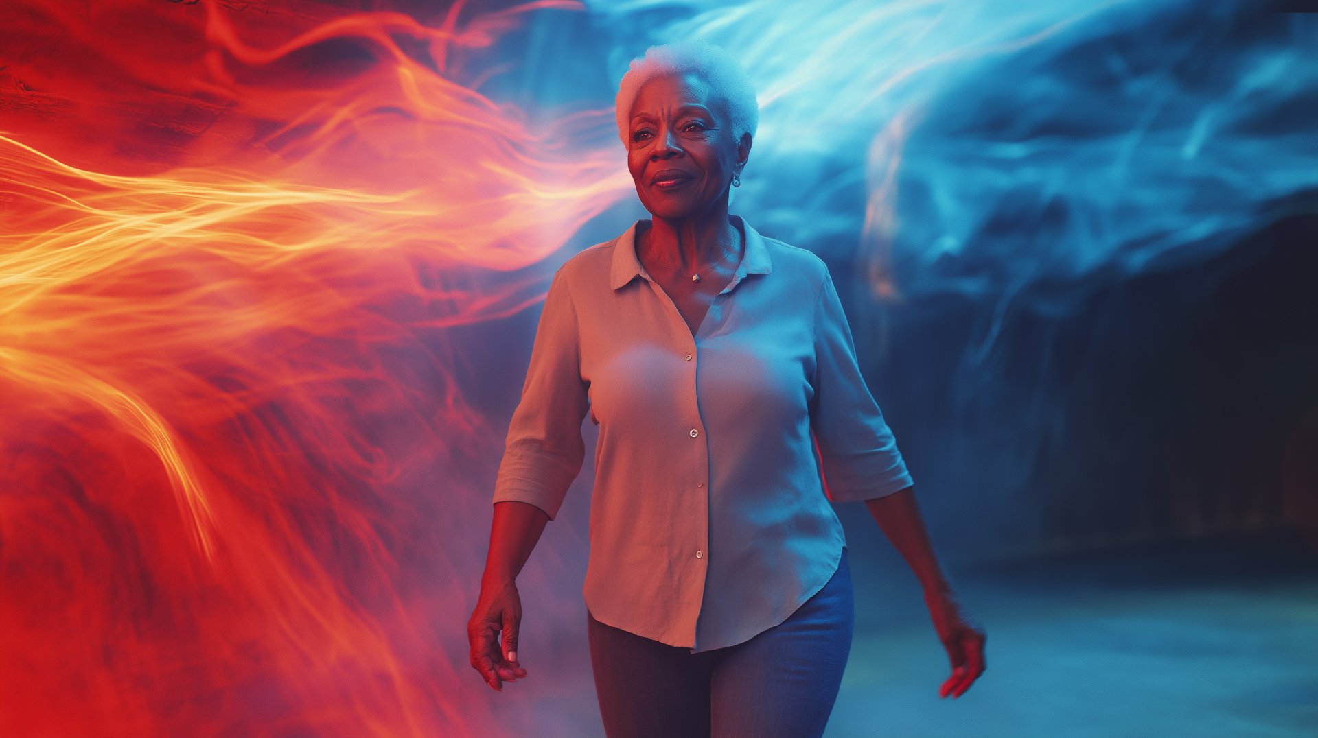 A photorealistic image of a confident black woman walking towards the camera with a willful gait. The scene is illuminated by magical red and blue light streaks emanating from her chest, creating an ethereal atmosphere.