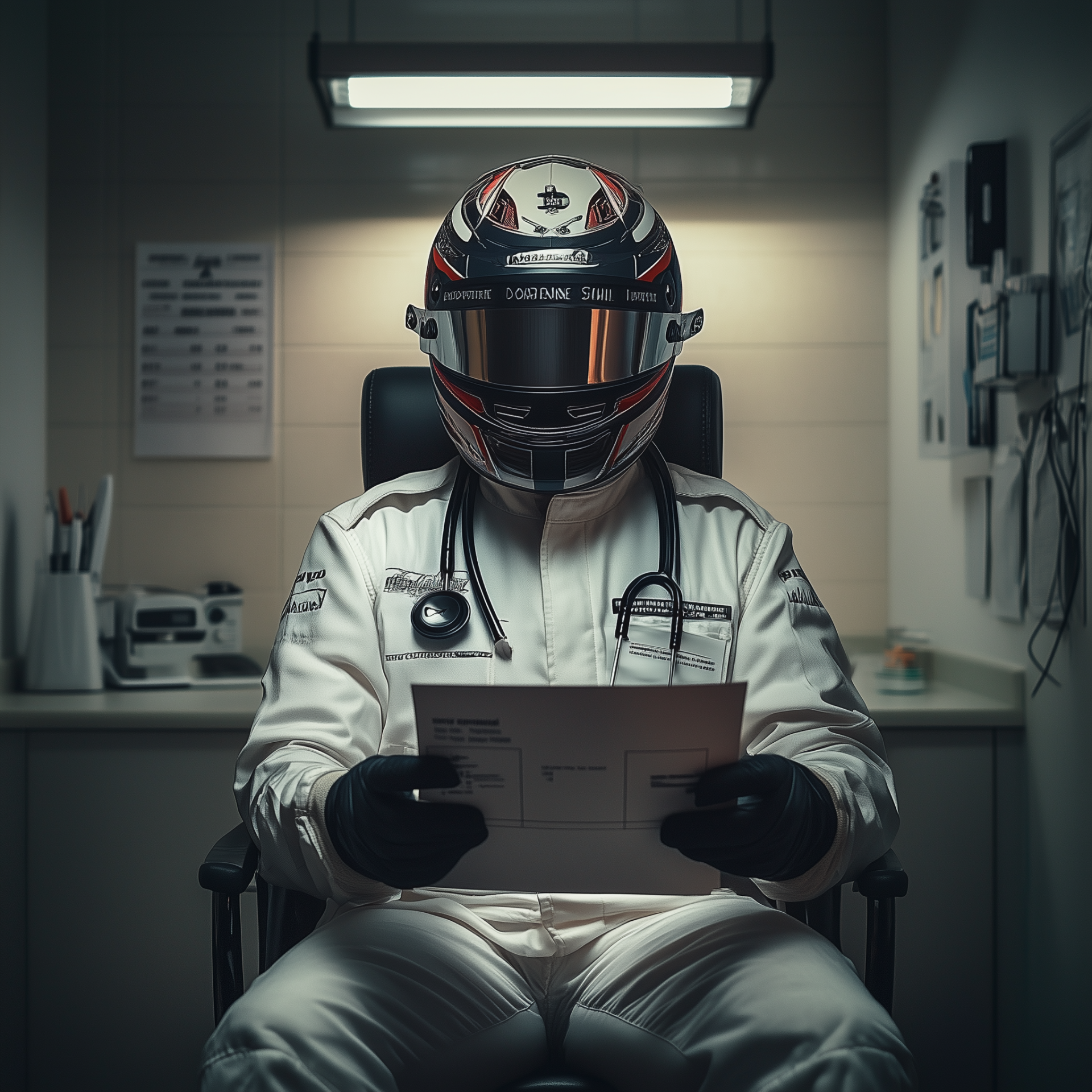 The image captures a formula one driver wearing a helmet and a doctor's coat, presenting a unique blend of sports and healthcare. The setting is well-lit with a professional ambiance typical of a doctor's office.