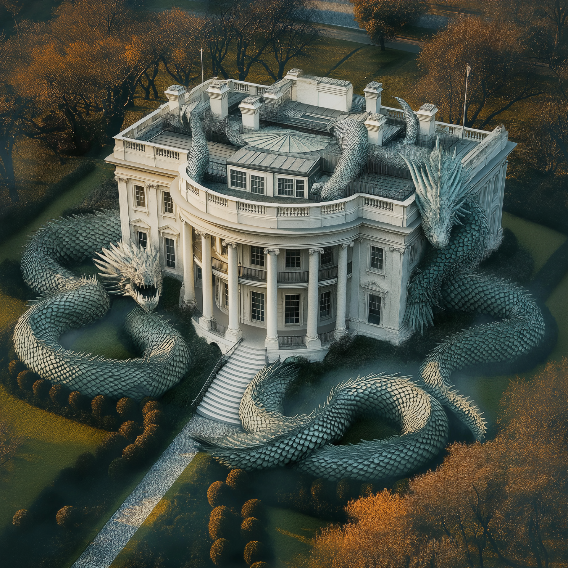 This image captures a stunning aerial view of The White House, artistically entwined by a massive dragon. The dramatic contrast of the vibrant dragon scales against the classic architecture of the White House creates a captivating and surreal atmosphere.