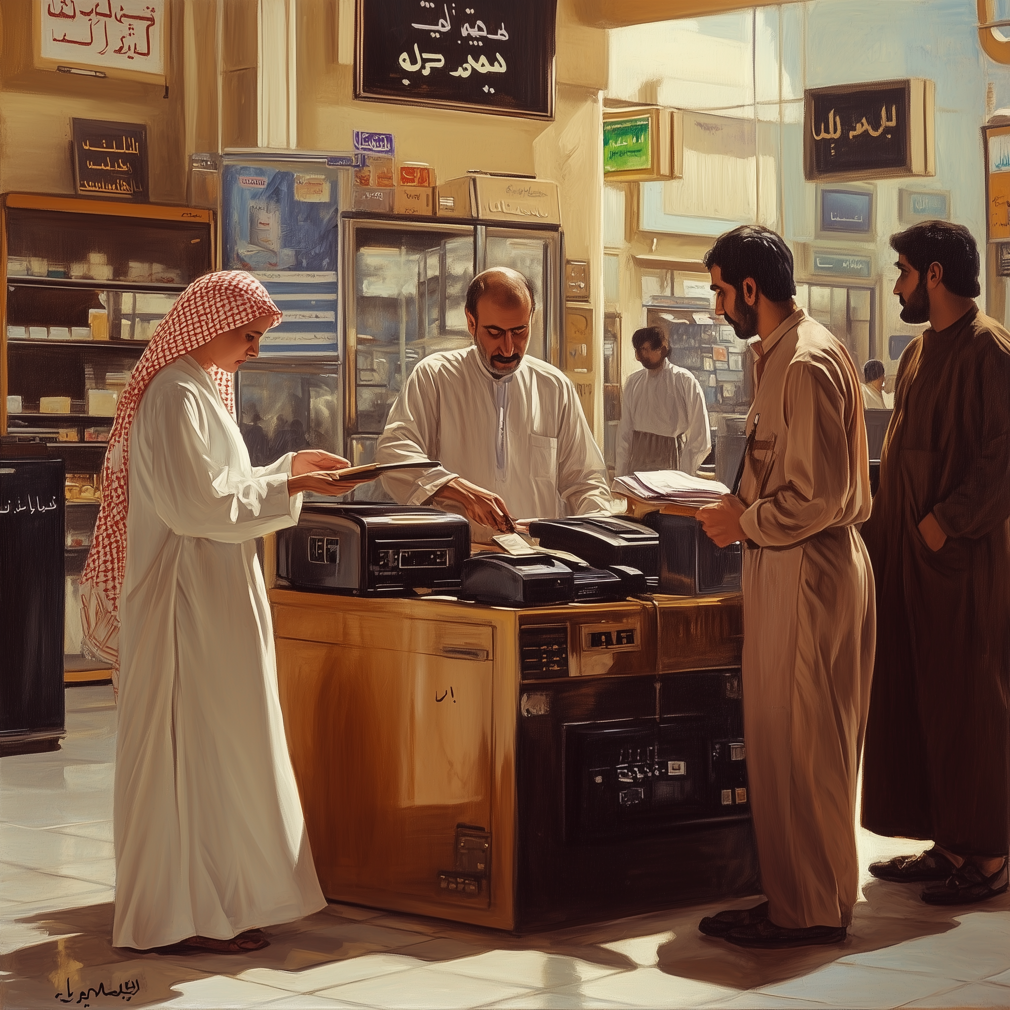 A nostalgic scene captures a 1970s Dubai mall shop filled with realistic home appliances. The ambiance reflects a vibrant market atmosphere, with a seller diligently writing down customer information while shoppers in traditional thobes browse the products.