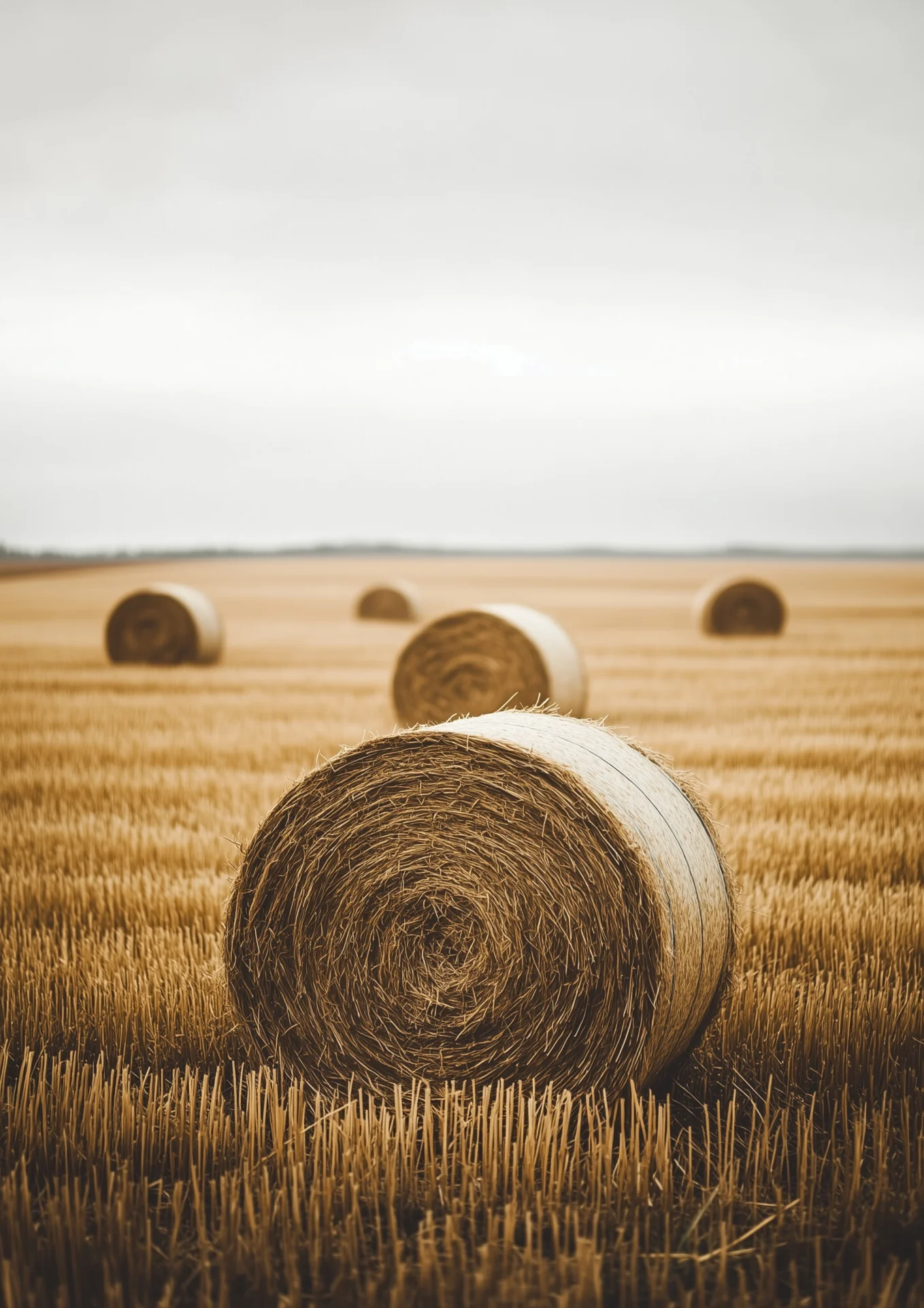 The image showcases a vast field filled with hay bales, enveloped in a dark and moody atmosphere. The realistic details highlight the textures of the bales and the surrounding landscape, creating a sense of solitude and calm.