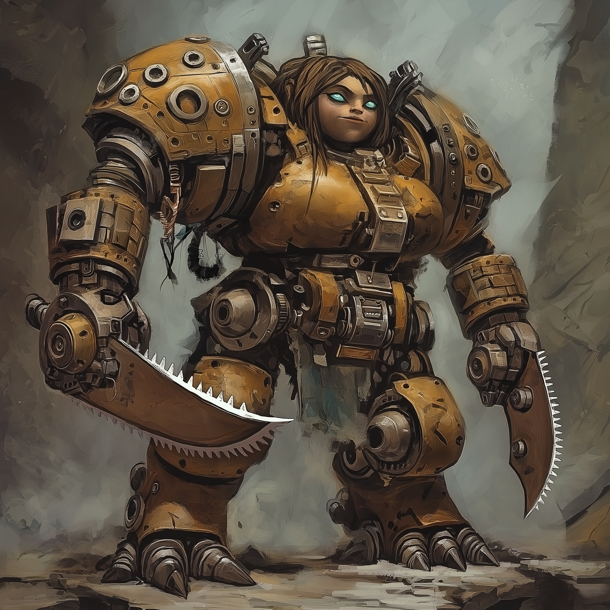 This illustration depicts a female Duergar dwarf clockwork golem, featuring intricate mechanisms and a metallic finish. The golem's arms are equipped with rotating blade saws, showcasing a blend of fantasy and steampunk elements.