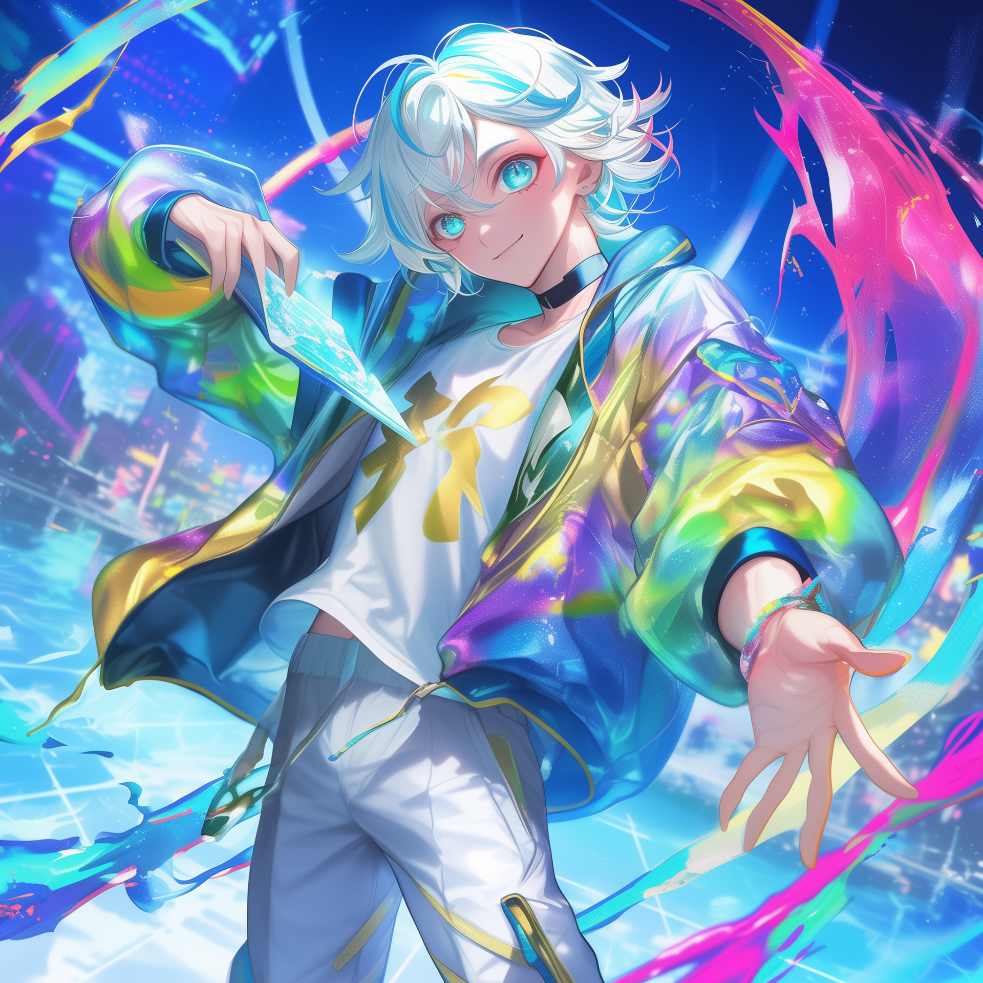 The image features a young man with striking pearlescent hair and glowing turquoise eyes. He exudes a charming aura, dressed in a colorful bomber jacket that enhances the vibrant, dynamic feel of the scene.