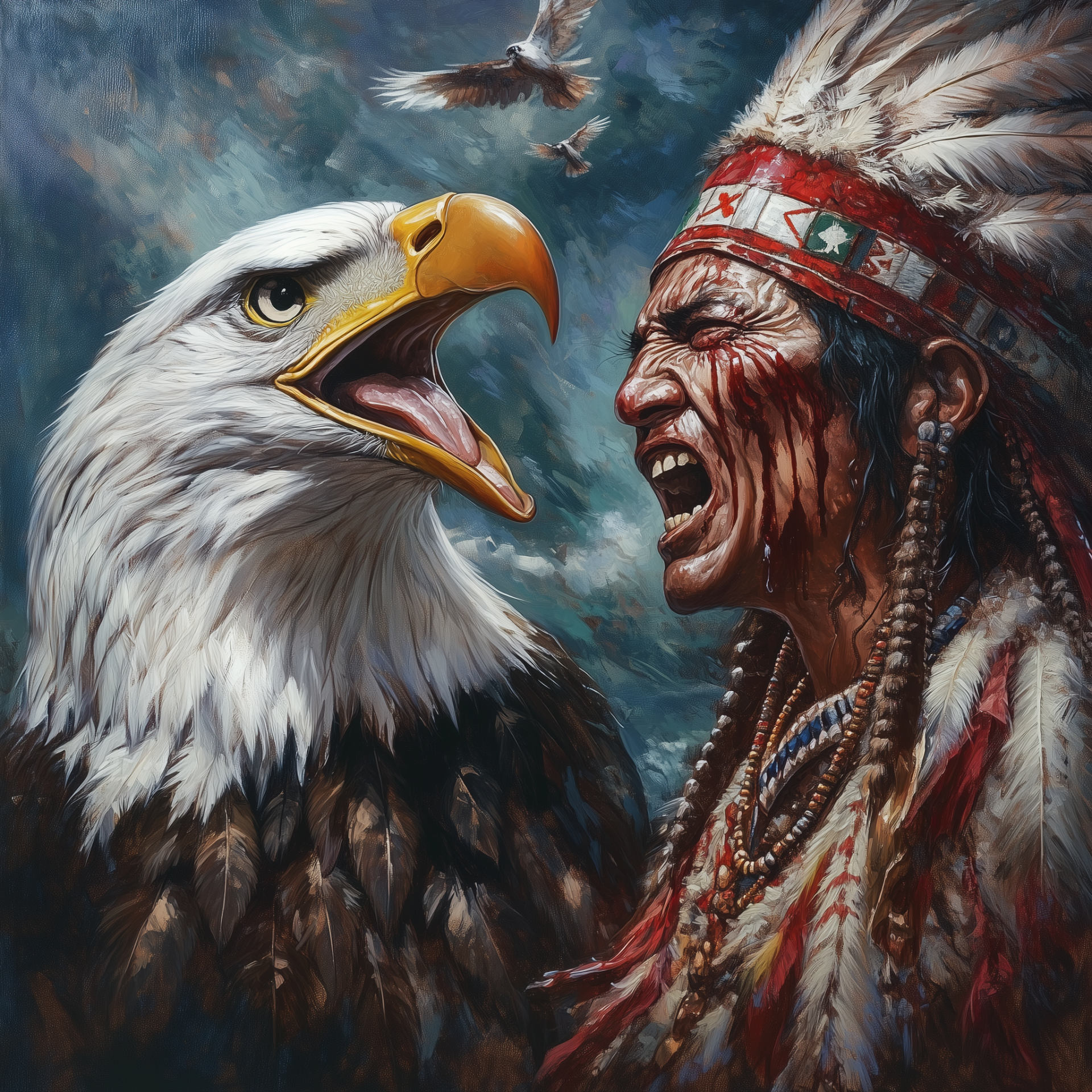 The image captures a powerful eagle with its wings spread wide, displaying its impressive strength and vibrant feathers. Below, an Indian chief appears surprised, adding an element of drama to this captivating moment.