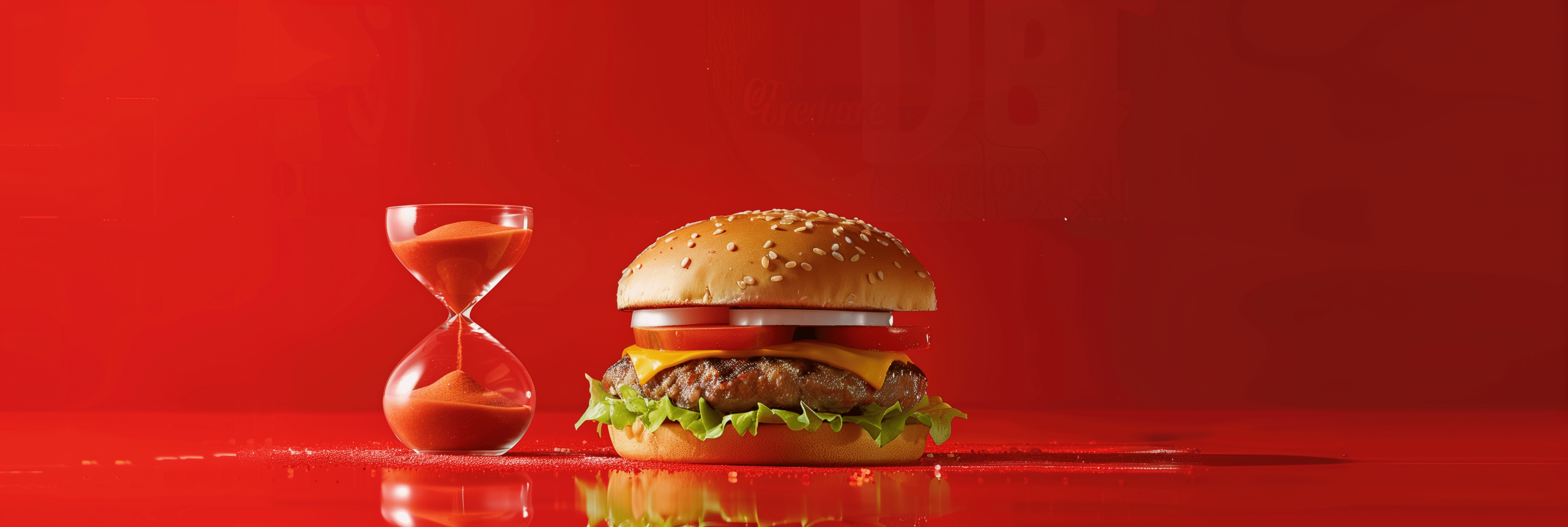 A tranquil scene featuring soft lighting and an hourglass set against a vibrant red backdrop. A subtle hint of a hamburger tour is displayed through a small sign, with the image of a hamburger intentionally blurred.