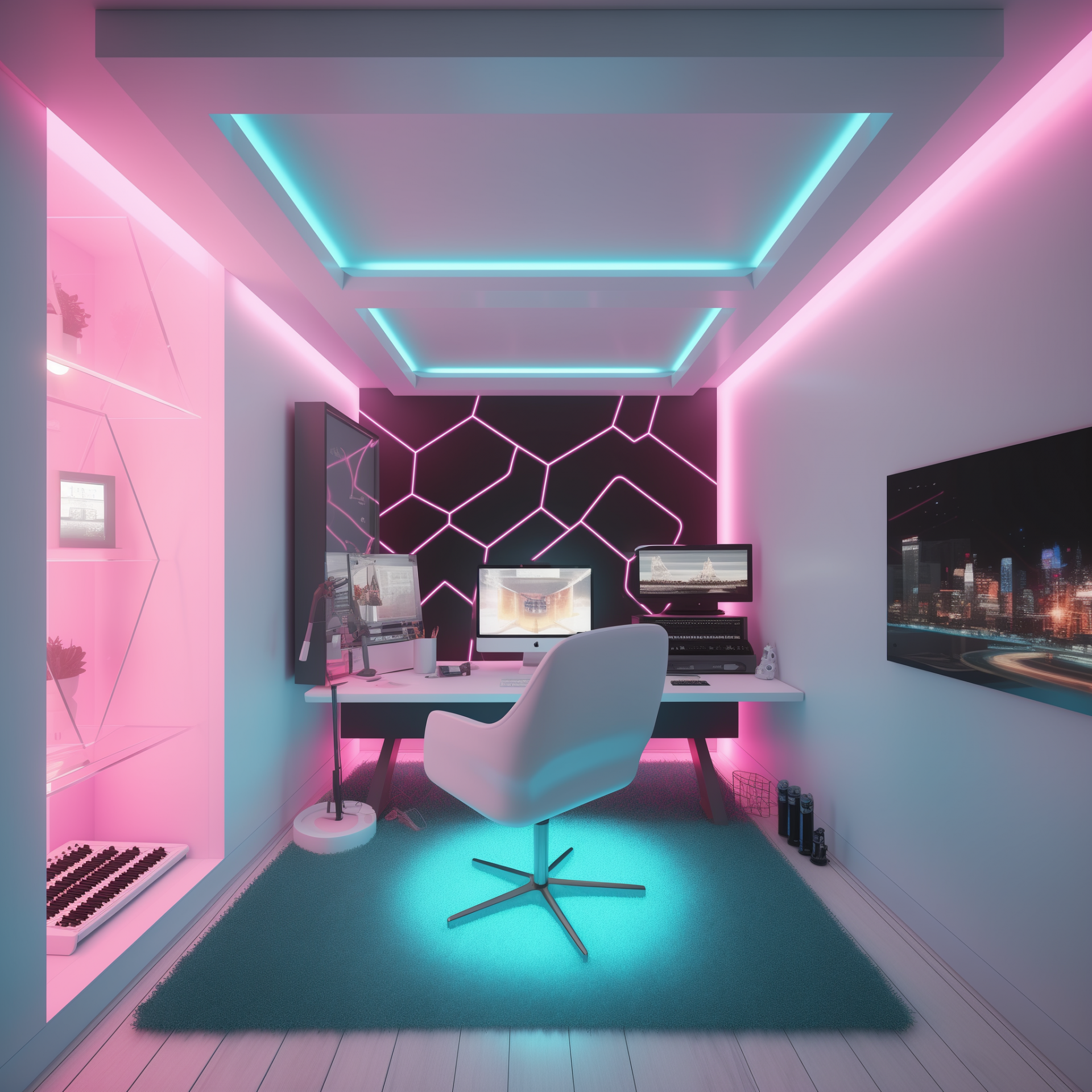 This image depicts a modern music studio designed for a young electronic music producer, showcasing an 80s aesthetic. It features vibrant neon pink and turquoise accents that create an energetic and creative atmosphere, perfect for drum and bass music production.