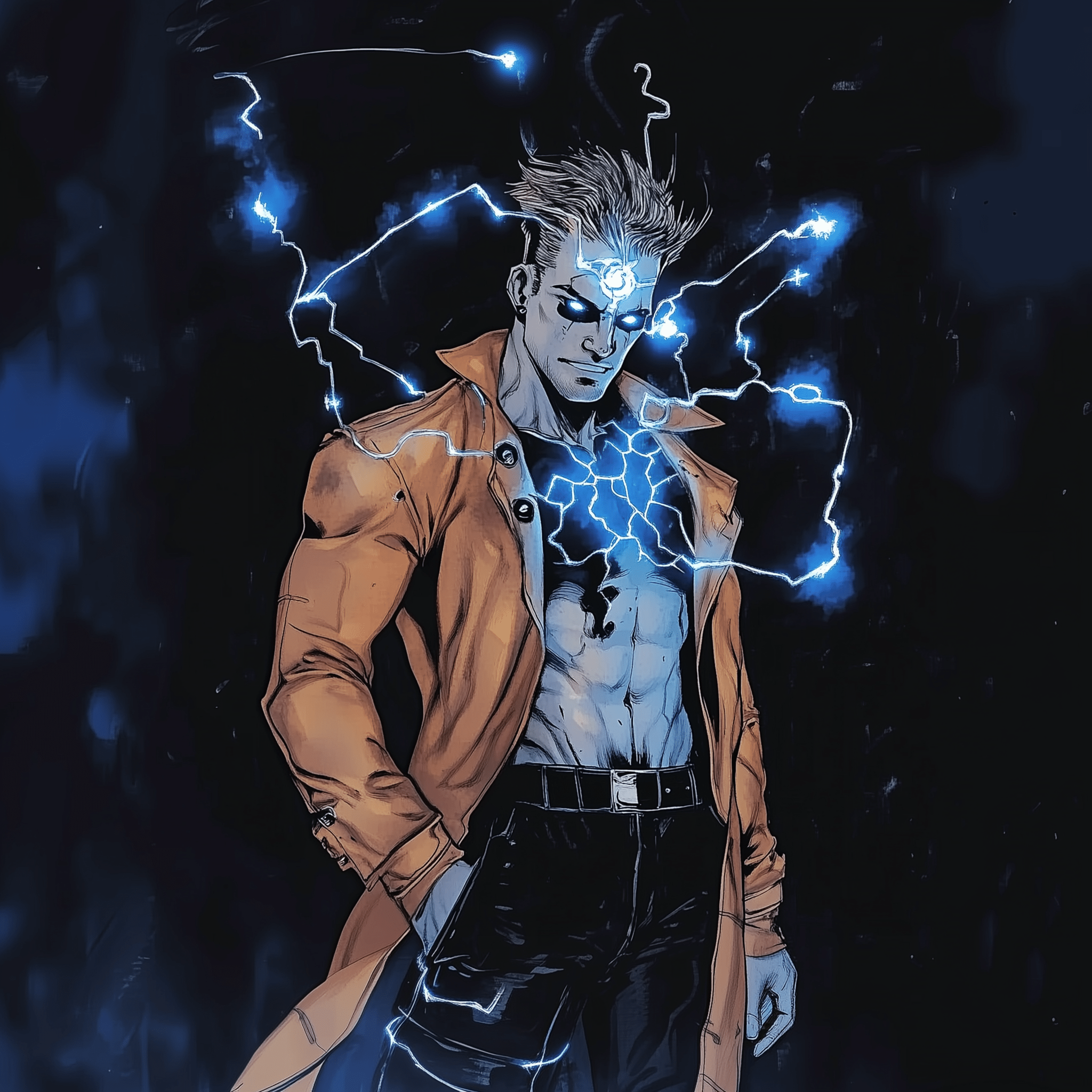 The illustration features a young man in a trench coat surrounded by blue electrical energy, giving off a vibrant and dynamic effect. Cybernetic nodes on his body sparkle with electricity, enhancing the superhero theme of the artwork.