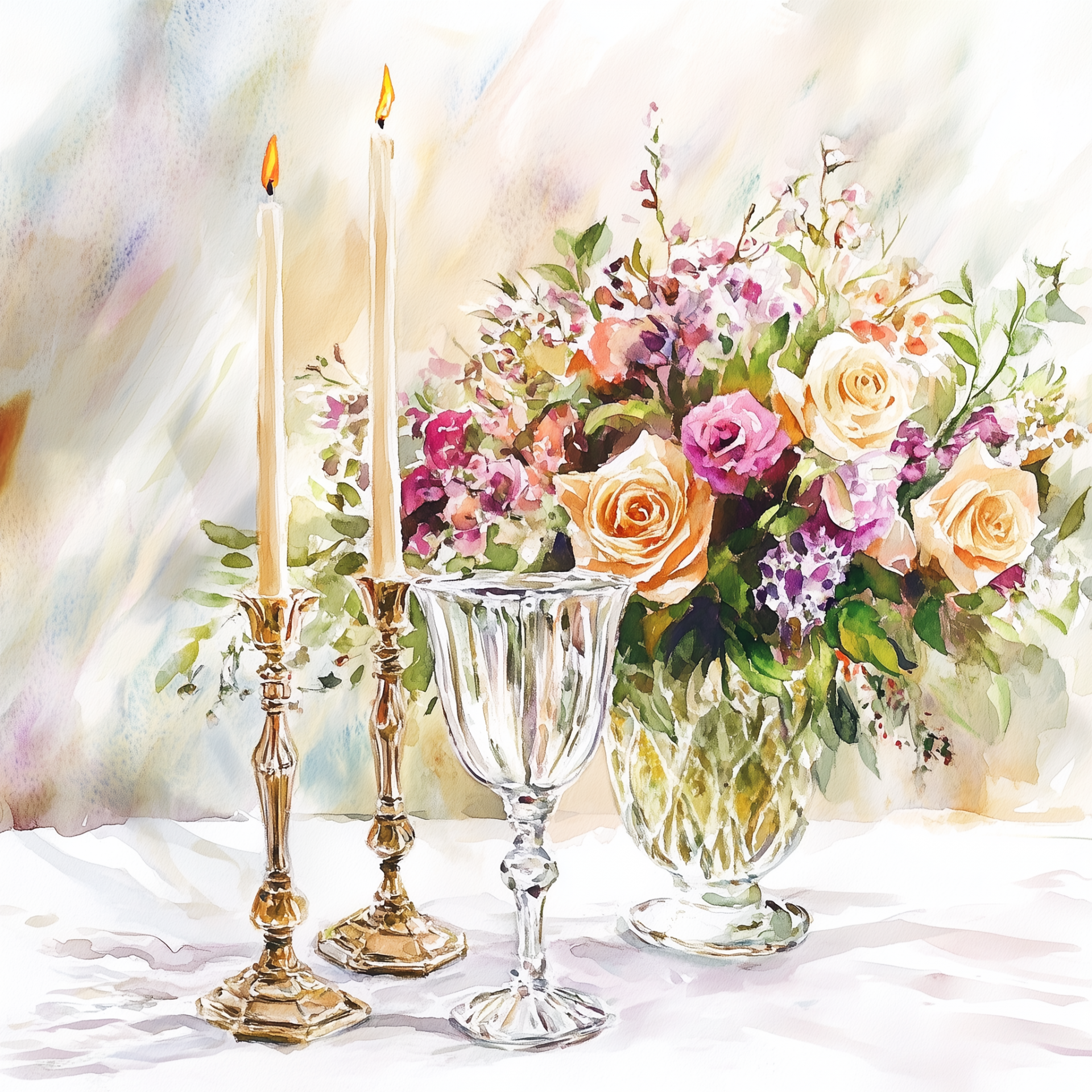 This image showcases a beautifully arranged table featuring a narrow glass with gold trim, complemented by long candles in a decorative candlestick. A fresh bouquet of flowers adds a touch of color to the scene, all captured in a charming watercolor style.