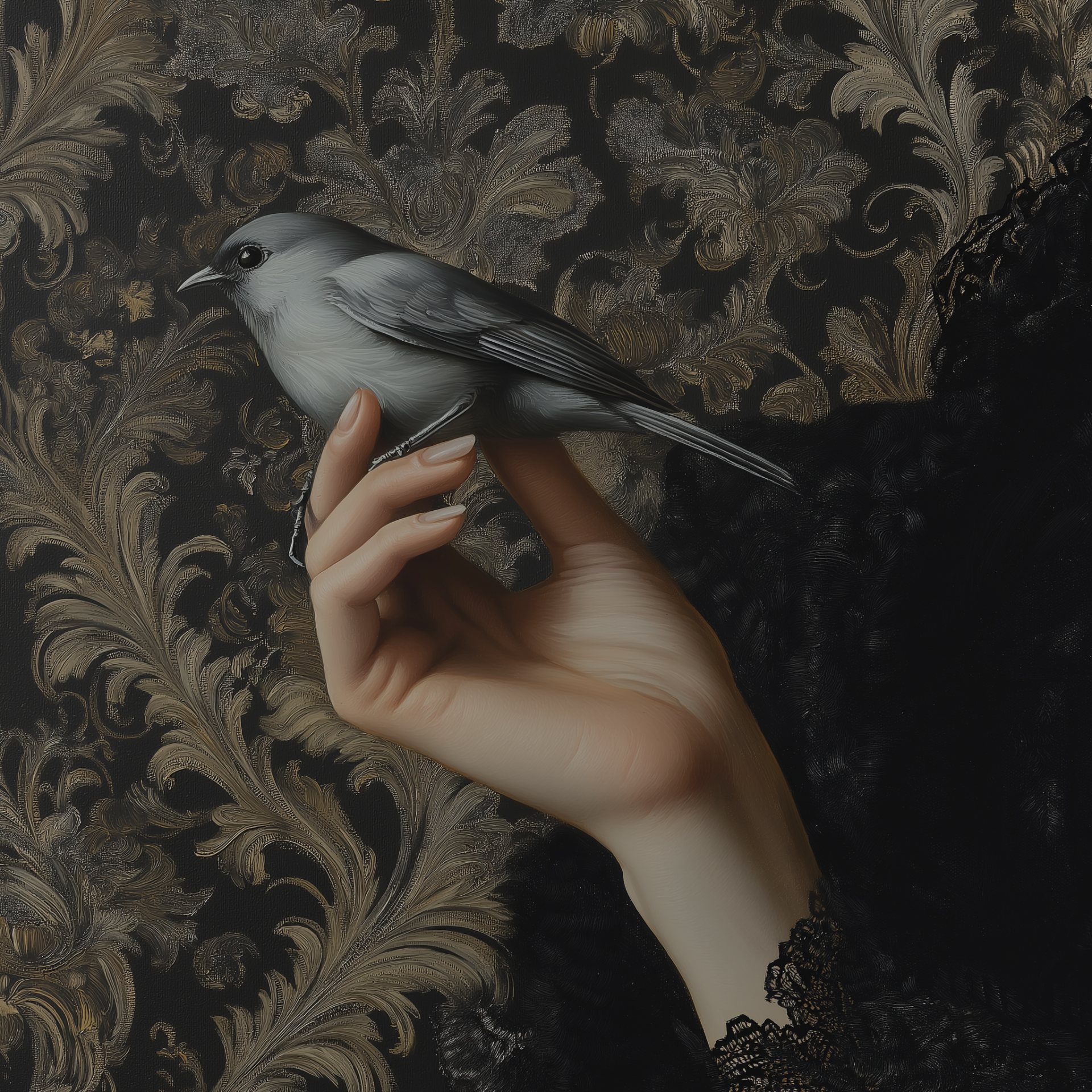 The painting depicts an elegant hand emerging from a dark gothic setting, gracefully holding a grey bird. The intricate details of the Victorian wallpaper in the background add to the overall mysterious and artistic atmosphere.