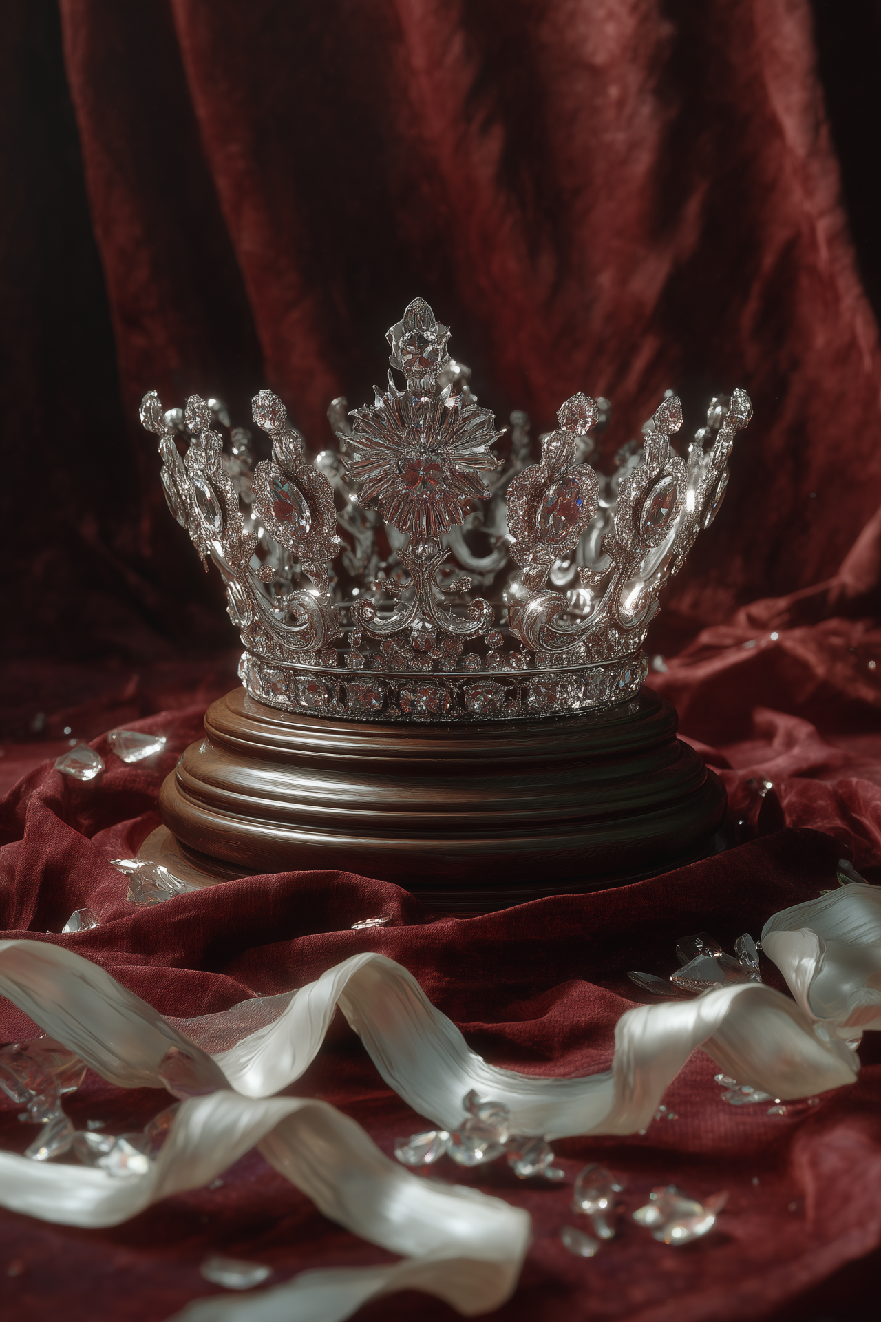 This striking image features a beauty queen crown elegantly displayed on a pedestal, surrounded by delicate short ribbons. The rich dark red fabric in the background adds a luxurious touch, enhancing the cinematic feel of the photograph.