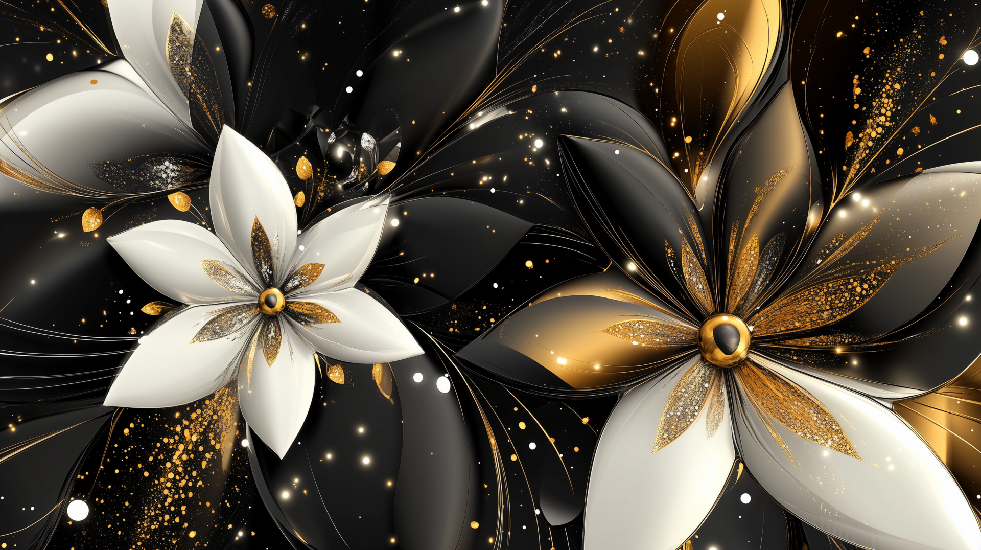 This image features a striking floral pattern composed of black, gold, and white colors, creating a luxurious feel. The design appears to flow elegantly, occupying minimal space while offering a stylish touch to any setting.