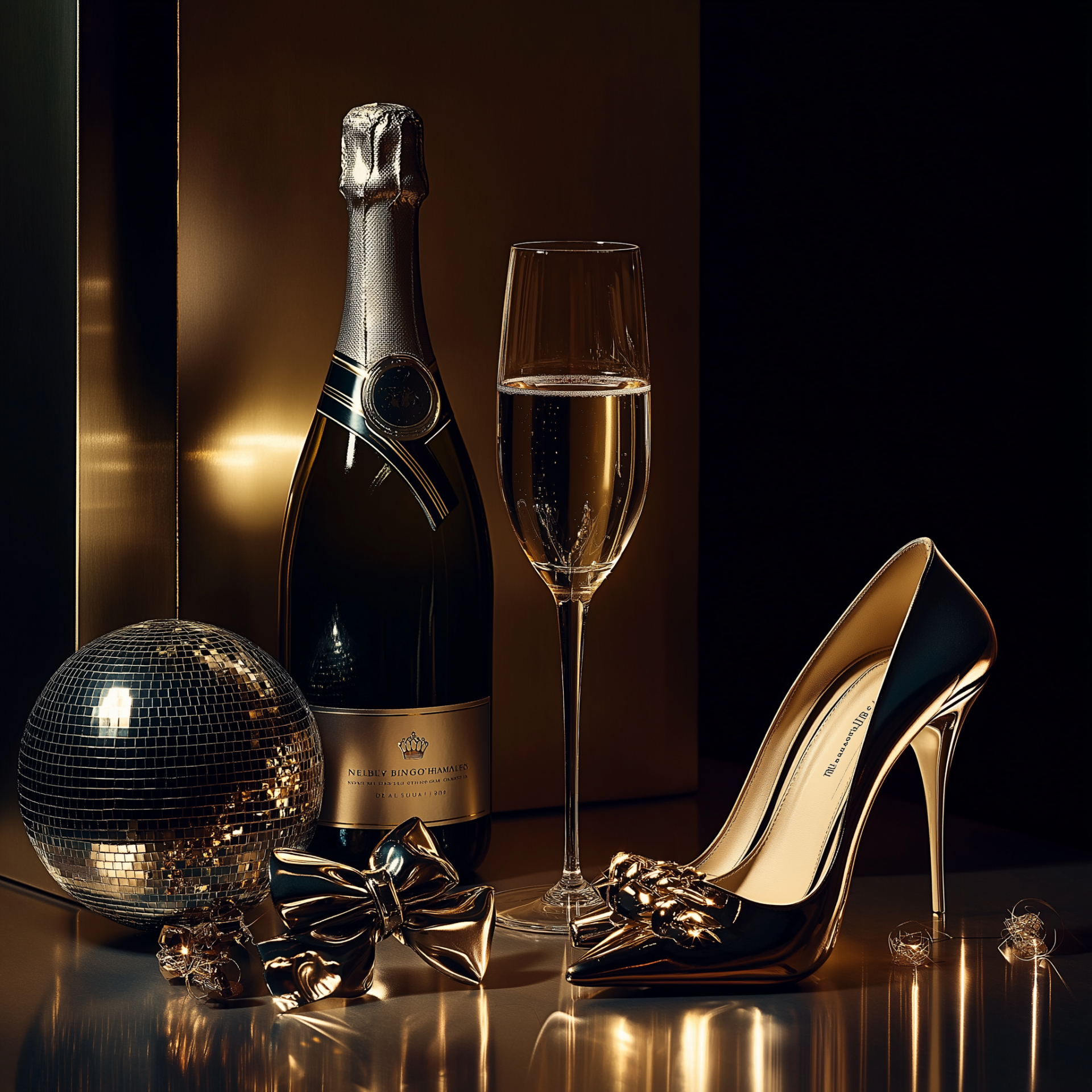 The image showcases an elegant New Year's Eve setting featuring stylish high heels balanced next to a champagne bottle and glass. A scattered bow tie and disco ball add a festive touch, all illuminated by warm studio lighting that emphasizes the luxury feel.