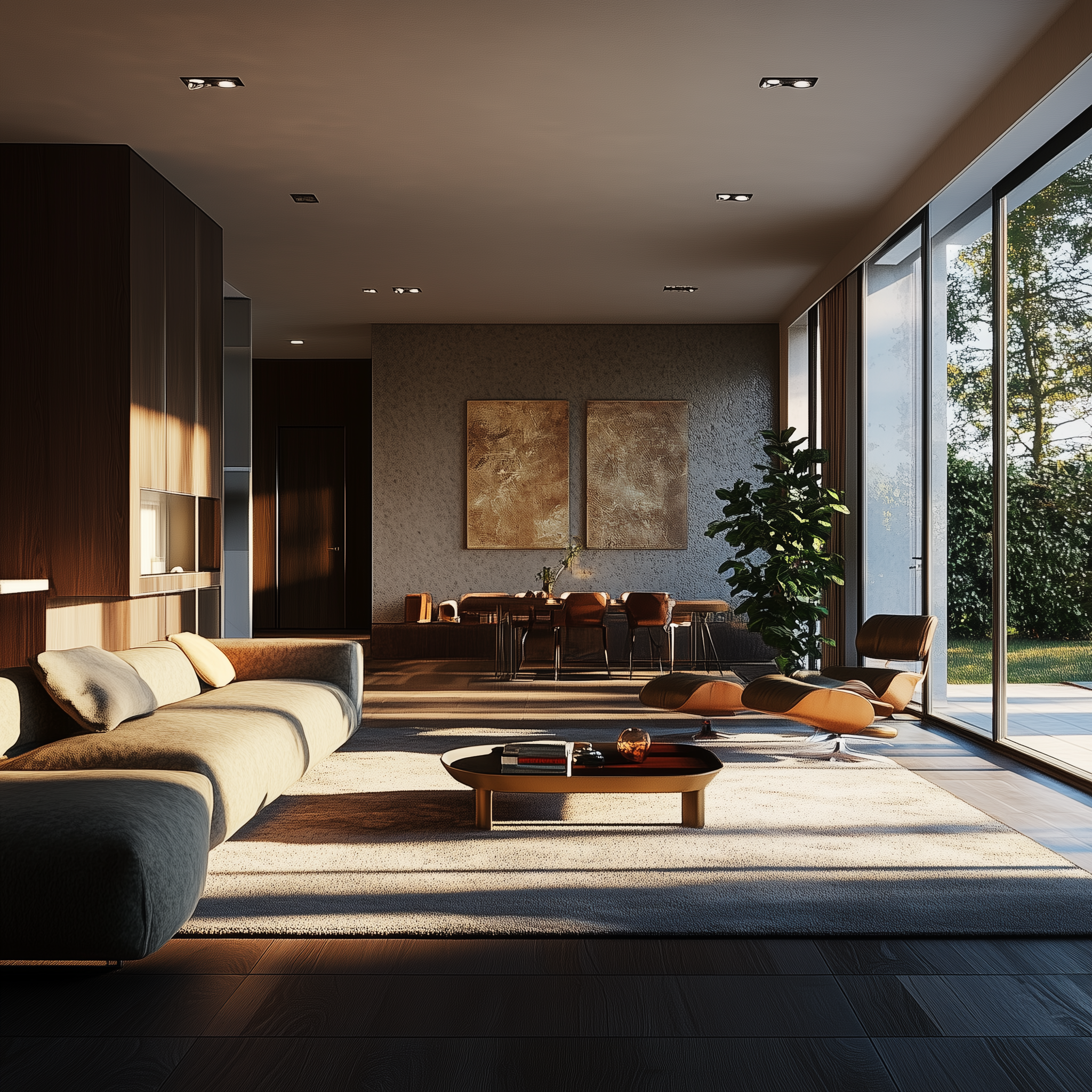 A hyper realistic image capturing a straight ahead view of a cozy living room, showcasing modern furniture and warm ambiance.