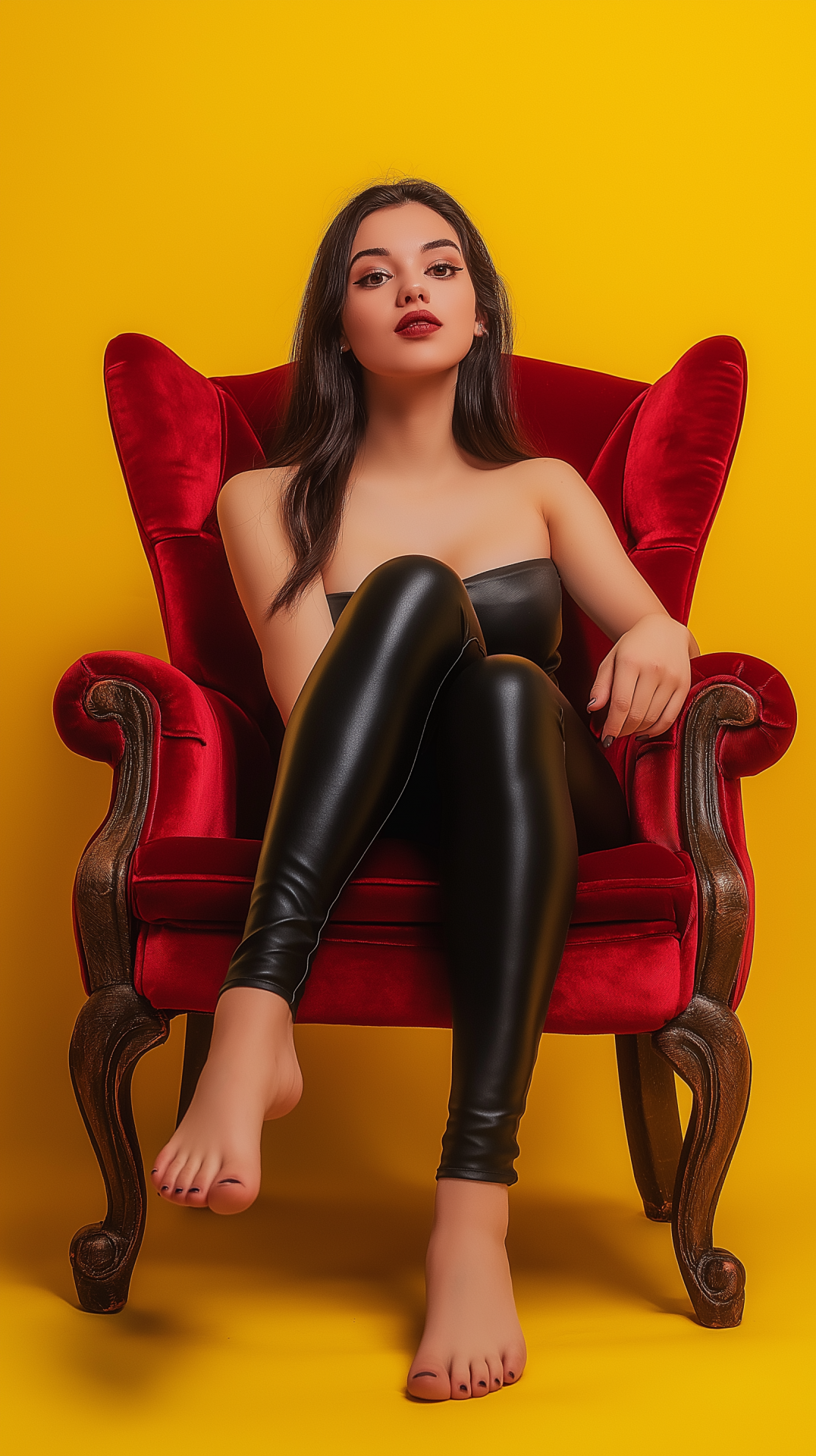 The image features an elegant woman with black hair, beautifully styled, seated on a luxurious red velvet chair. The vibrant yellow background adds a striking contrast, enhancing the overall sophistication of the composition.