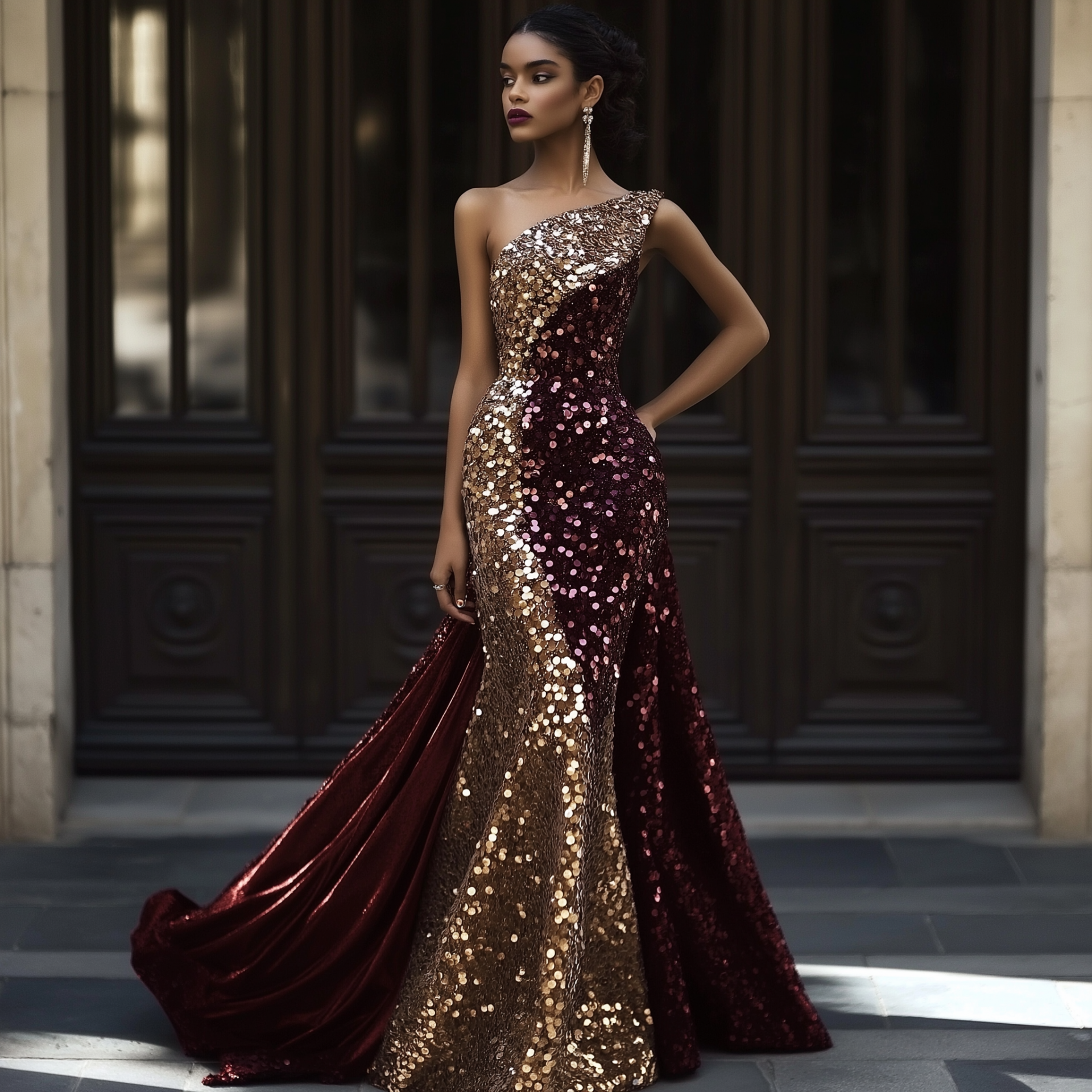 The image showcases a stunning young woman in an elegant gown that consists of burgundy fabric adorned with gold sequins and gems. She stands gracefully in front of beautiful double doors, exuding sophistication and poise.