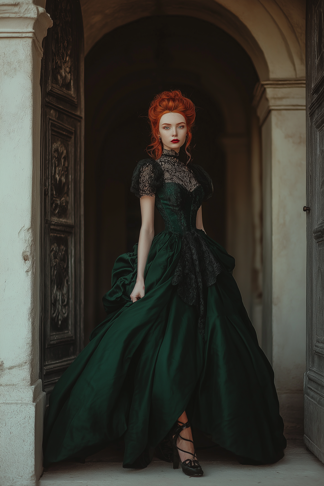The image features a stunning young woman with red hair styled elegantly, posing in a deep green gown that highlights her figure. A beautiful arched doorway serves as a charming backdrop, enhancing the overall ambiance of grace and sophistication.