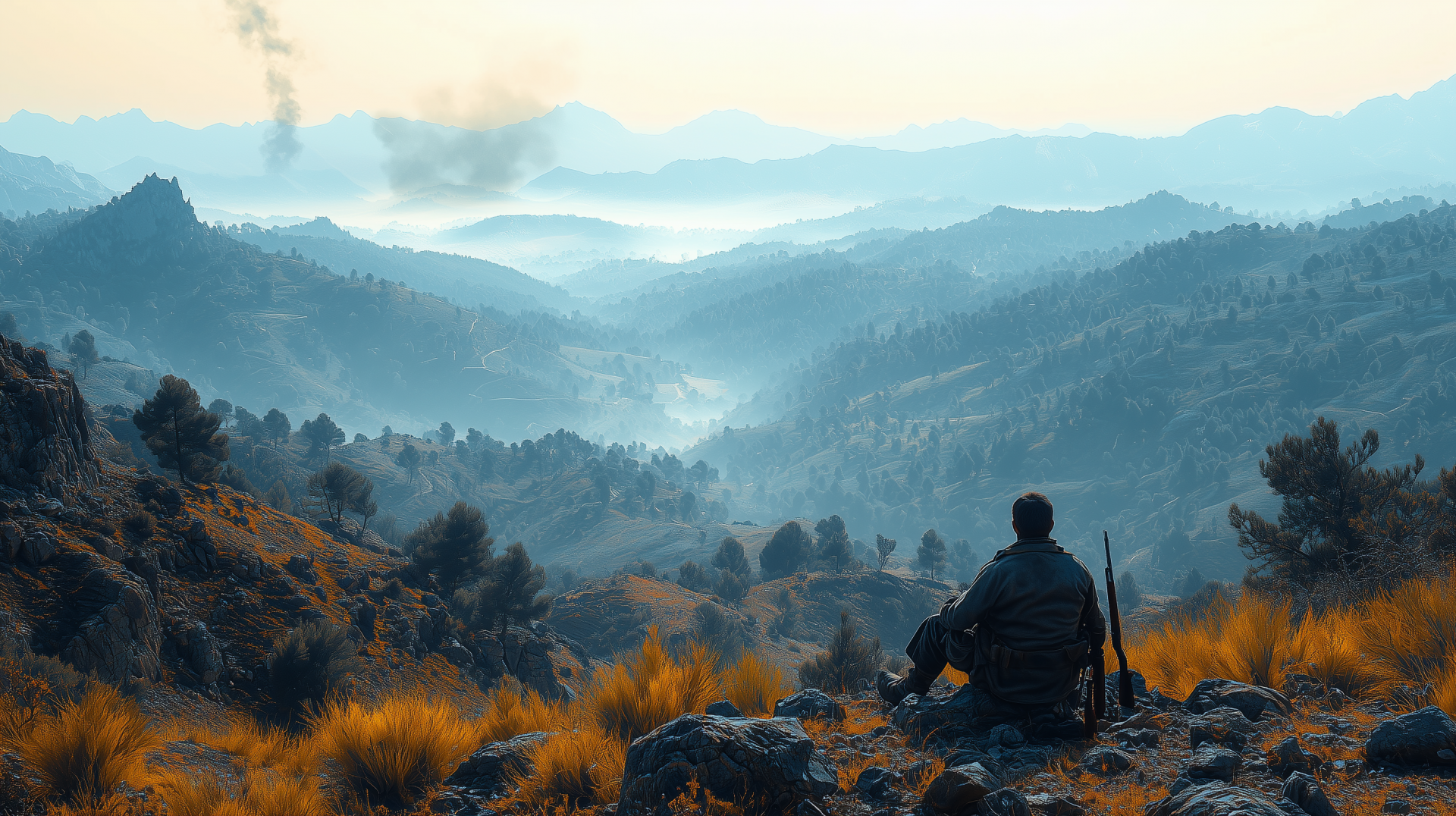 This image showcases a sprawling mountainous landscape in 1930s Spain, characterized by its rugged and barren terrain. The pale, overcast sky enhances the sense of desolation and vastness that envelops the scene.