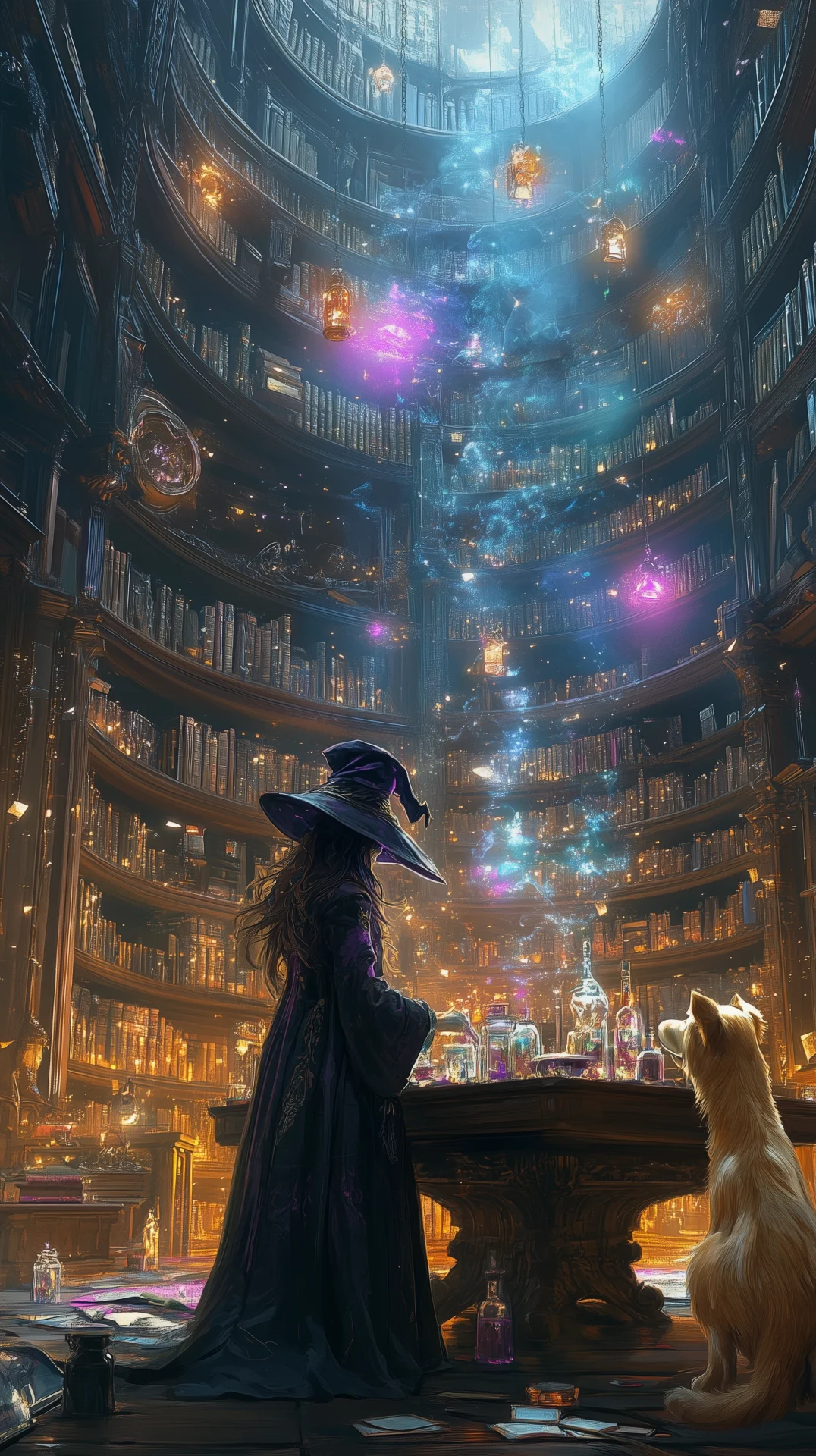 The image depicts the enchanting ruins of an ancient elven temple, showcasing intricately curved architecture. Sunlight filters through broken stained glass windows, illuminating a serene goddess statue at the altar, surrounded by wildflowers and vines.