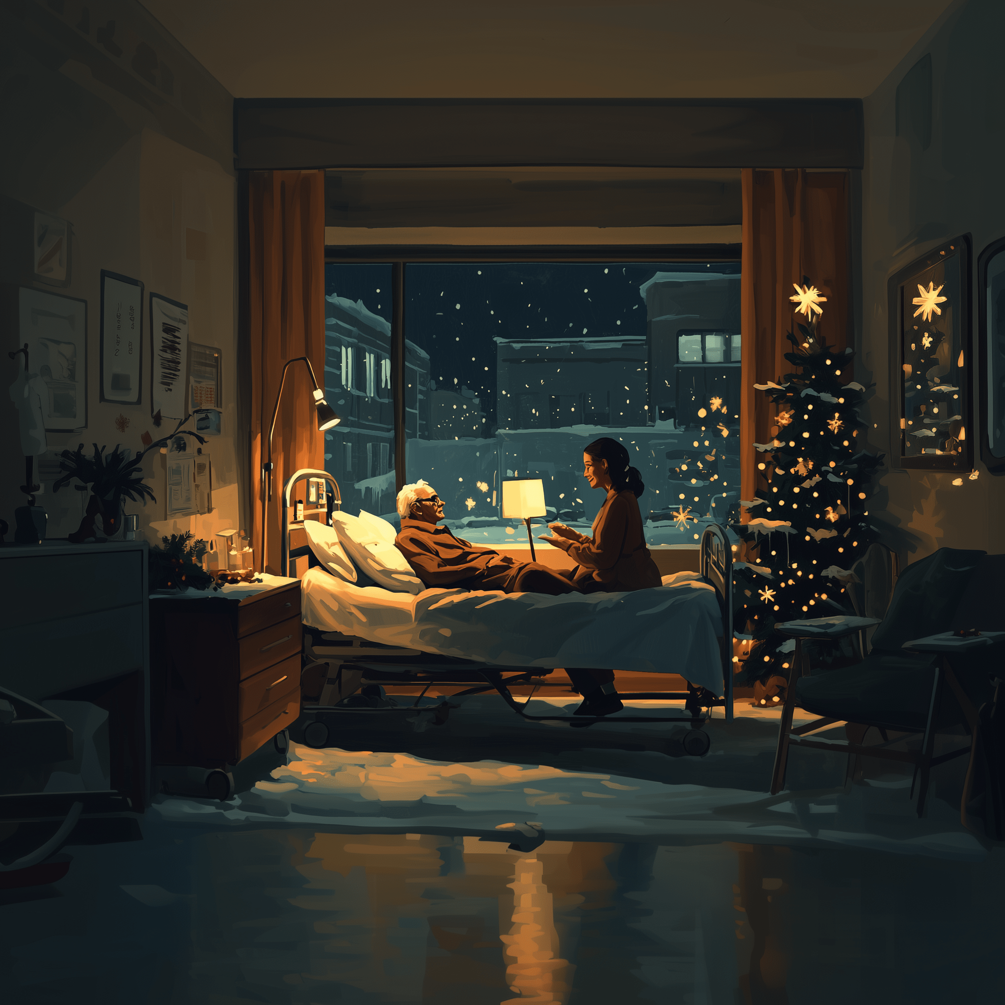 A friendly modern female nurse sits beside the bed of an old man patient in a modern hospital room on Christmas night, both staring out onto a snowy city. The scene is depicted in a cozy and warm interior style, reminiscent of a New Yorker cover, creating a nostalgic and slightly whimsical atmosphere.