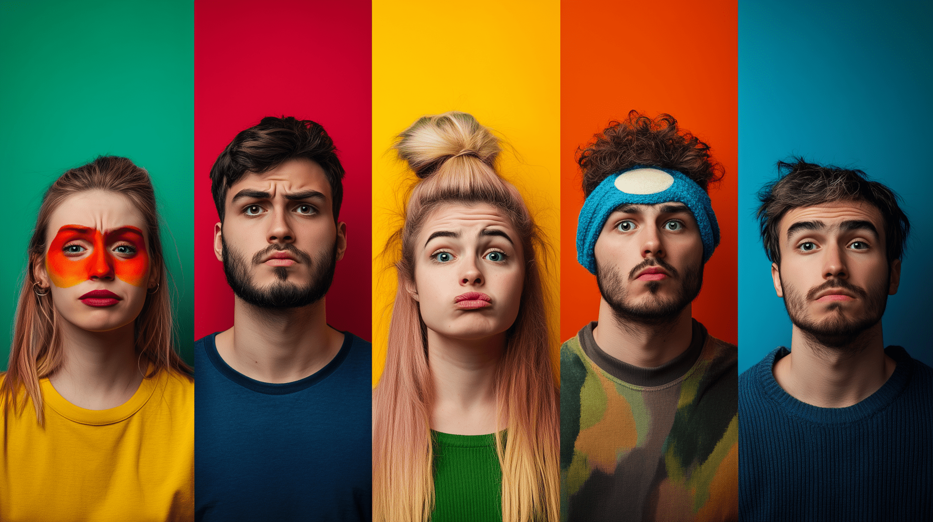 This image showcases a wide-angle portrait featuring individuals displaying a range of emotions including sadness, anger, depression, hyperactivity, happiness, and oddity. Each person's expression reflects their unique personality, creating a vibrant and dynamic composition.