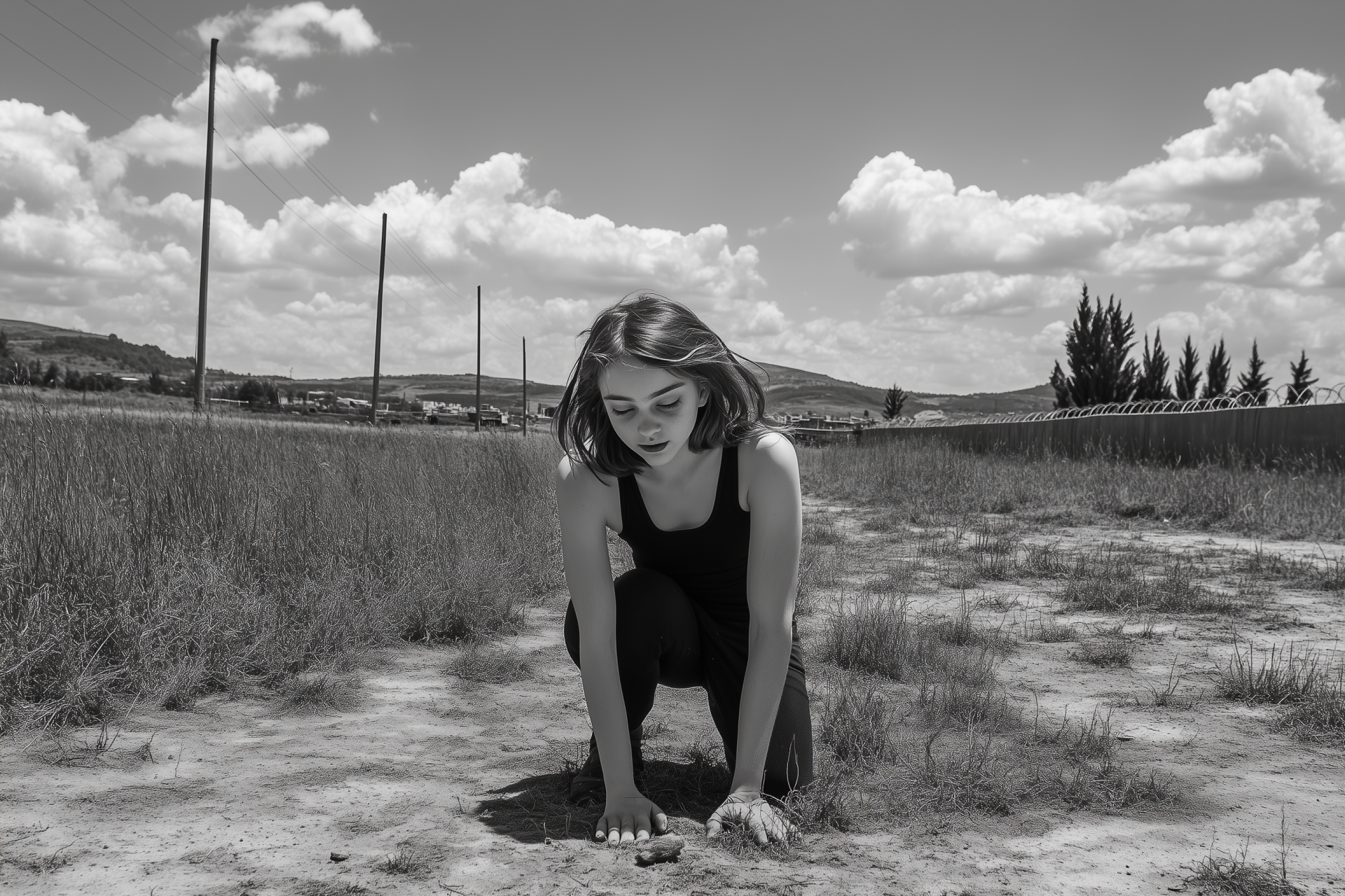 The image captures a solemn scene in a vast, empty grassy area, emphasizing the starkness of the surroundings. A girl kneels in the sun, conveying feelings of pain and loneliness amidst the desolate landscape.