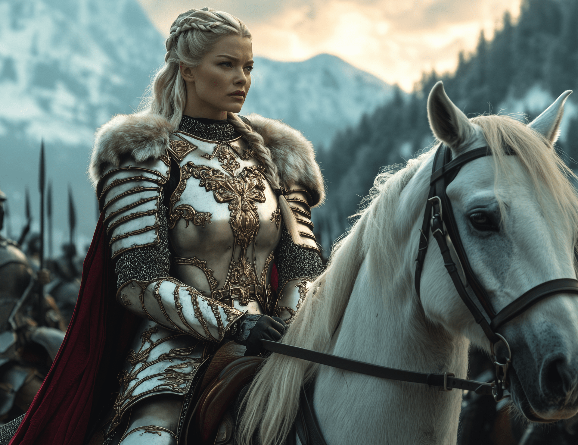 A heroic scene captures a blonde female warrior clad in shiny armor with a striking red fur cloak, confidently mounted on a magnificent war horse. The winter mountain backdrop and golden hour lighting create an atmosphere of an epic medieval battlefield, filled with intensity and drama.