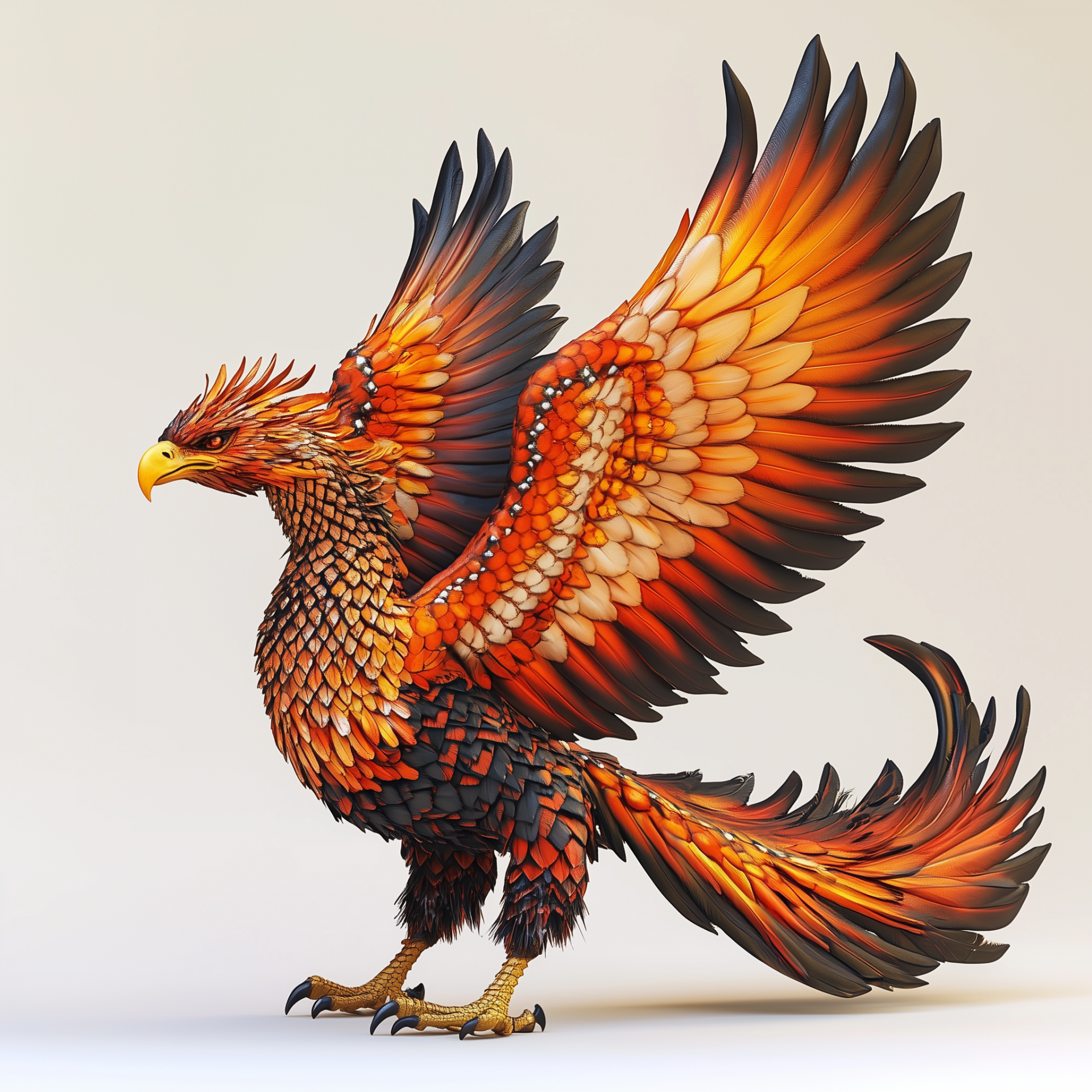 This image showcases a stunning full-body side shot of a gigantic and majestic phoenix, characterized by its impressive wings and a sleek, powerful presence. The hand-painted details and celestial elements create a fantastical aura against a white background, highlighting the bird's vibrant colors and otherworldly features.