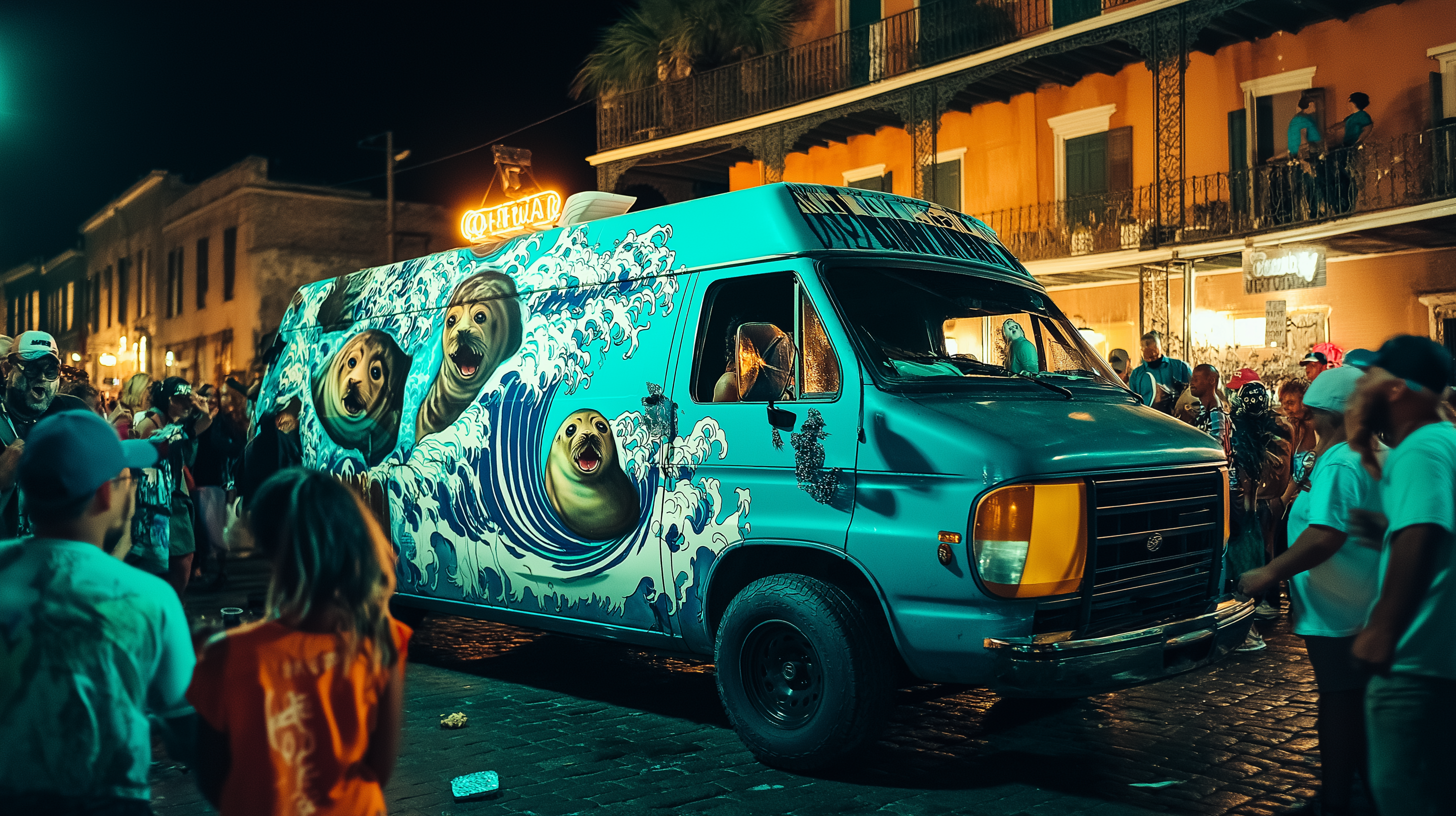 This vibrant image showcases a teal van adorned with stunning seal and ocean waves artwork, parked in the lively streets of New Orleans. Surrounded by a bustling crowd at night, the scene radiates a fun and dynamic atmosphere with numerous speakers adding to the excitement.