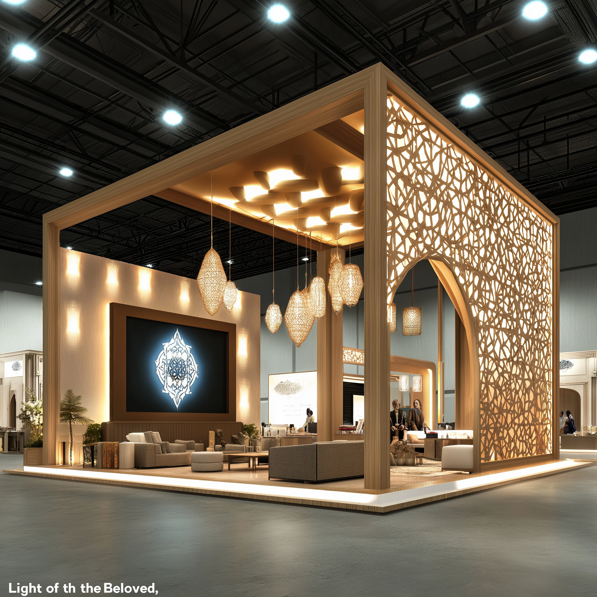 The booth is designed to evoke a sense of serenity and peace, utilizing elements of Islamic architecture with intricate patterns and warm lighting. Soft textures and delicate motifs create an inviting space, embodying the theme of light and love.