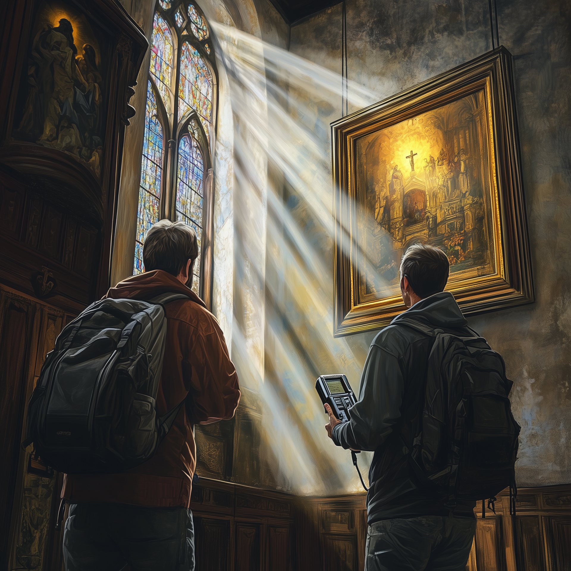 The image features two men holding metal detectors as they admire a painting within the beautiful St. Nicholas Church in Prague. Sunlight streams through the vibrant stained glass windows, creating a vivid and captivating atmosphere in a hyperrealistic comic style.