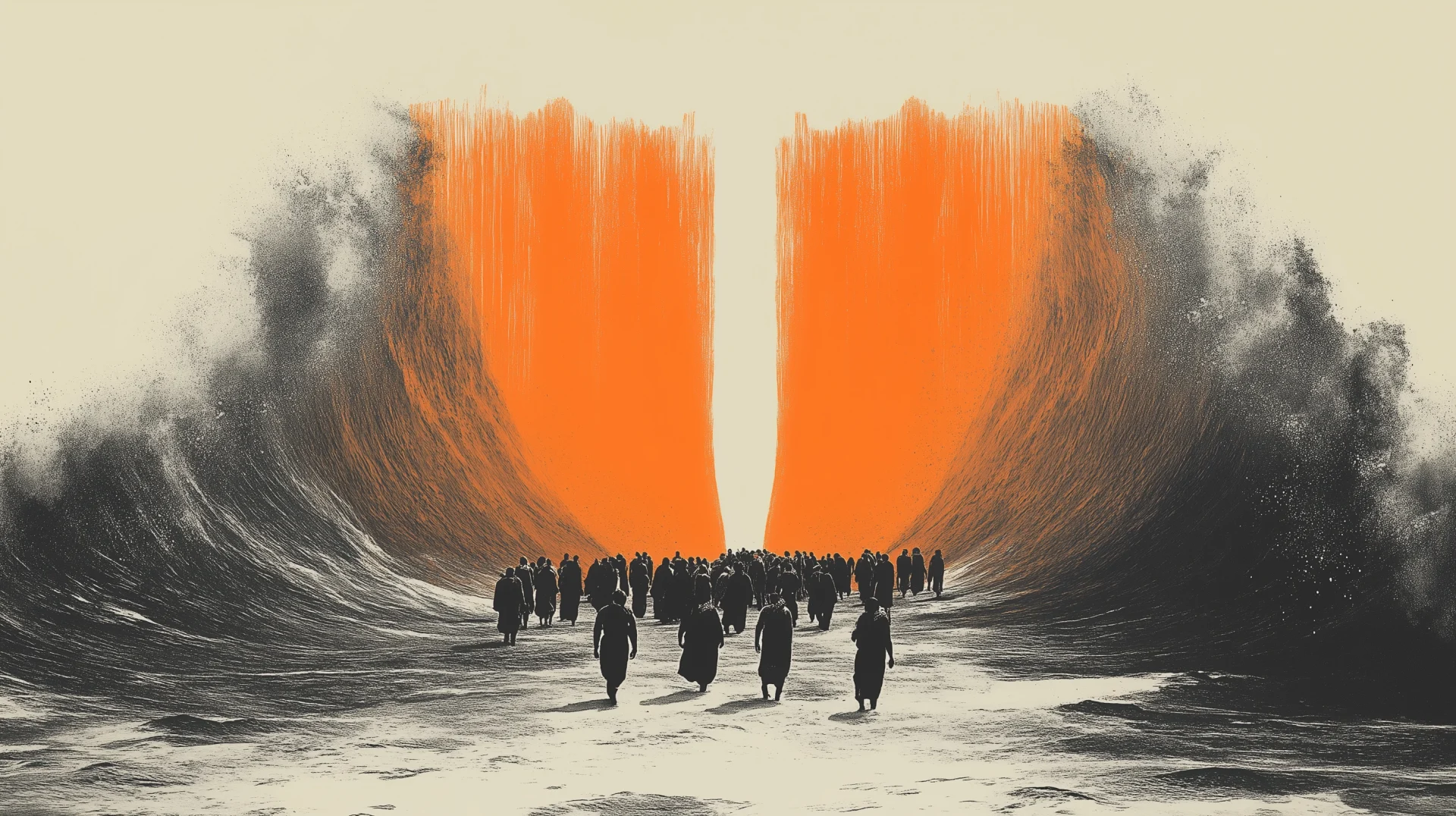 The illustration depicts a dramatic scene of Moses with raised arms, creating a path through the Red Sea. Walls of water tower on both sides, embodying a moment of divine intervention and awe.
