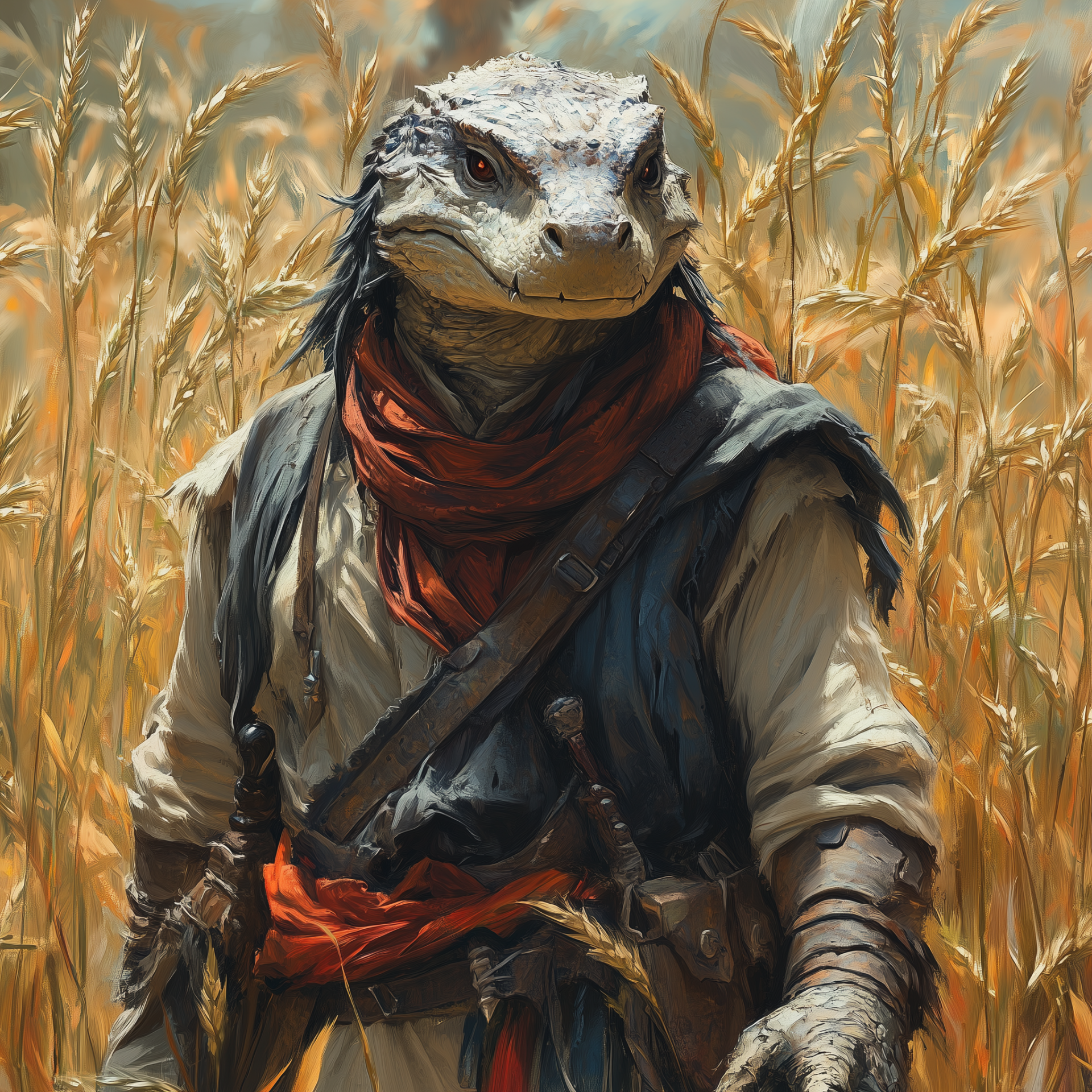 The image depicts a wereshark lizardfolk strolling through a golden barley field, surrounded by swaying stalks under a clear sky. The creature exudes an air of strength and mystery, blending elements of fantasy and nature harmoniously.