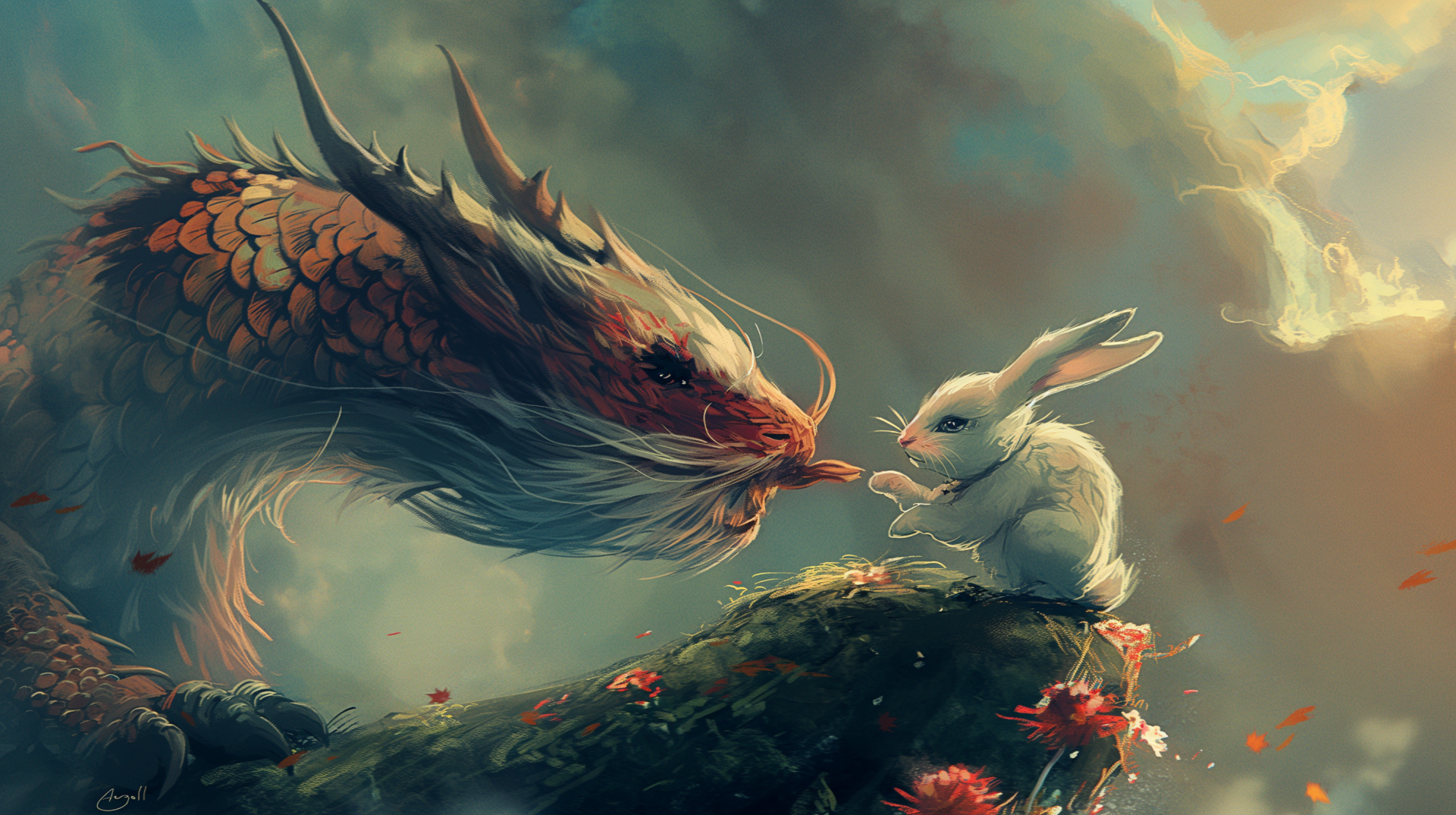 This illustration features a colorful depiction of a dragon gracefully handing over a baton to a rabbit, symbolizing the transition between two dynamic forces. The artwork incorporates vibrant colors and whimsical details that evoke a sense of harmony and change.