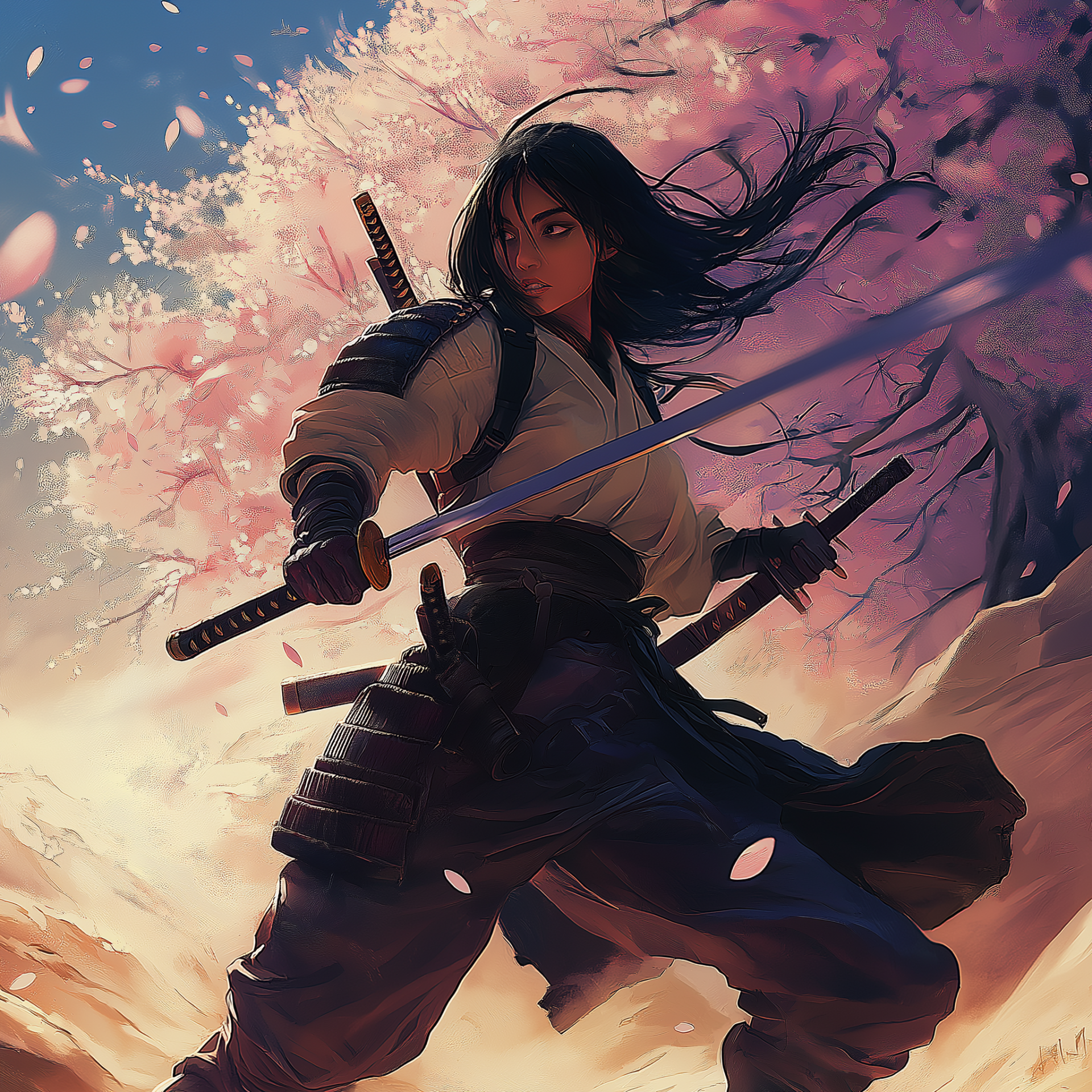 This image captures a dynamic moment of a character dressed in a ninja warrior outfit, with hair flowing wildly as they dash forward. Background details include a glowing sakura tree, creating a magical atmosphere enhanced by floating cherry blossoms and distant samurai shadows.