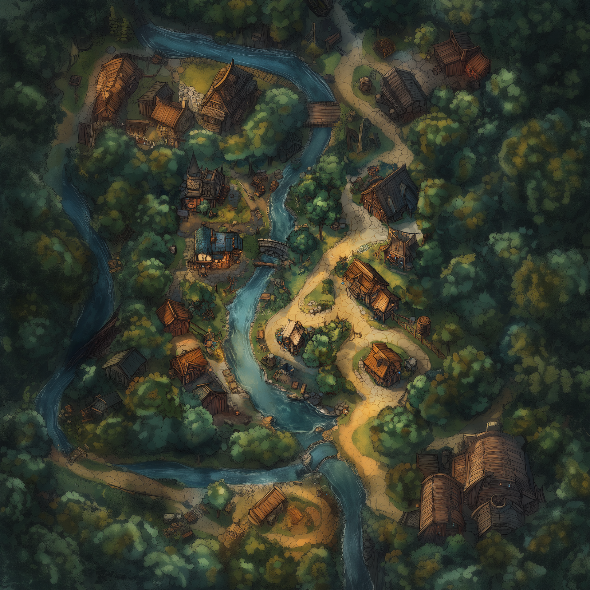 This image depicts a detailed fantasy battlemap of a village named Toad Hop. Features include a winding river, a cozy tavern, and various houses and shops, all illustrated in vibrant colors.