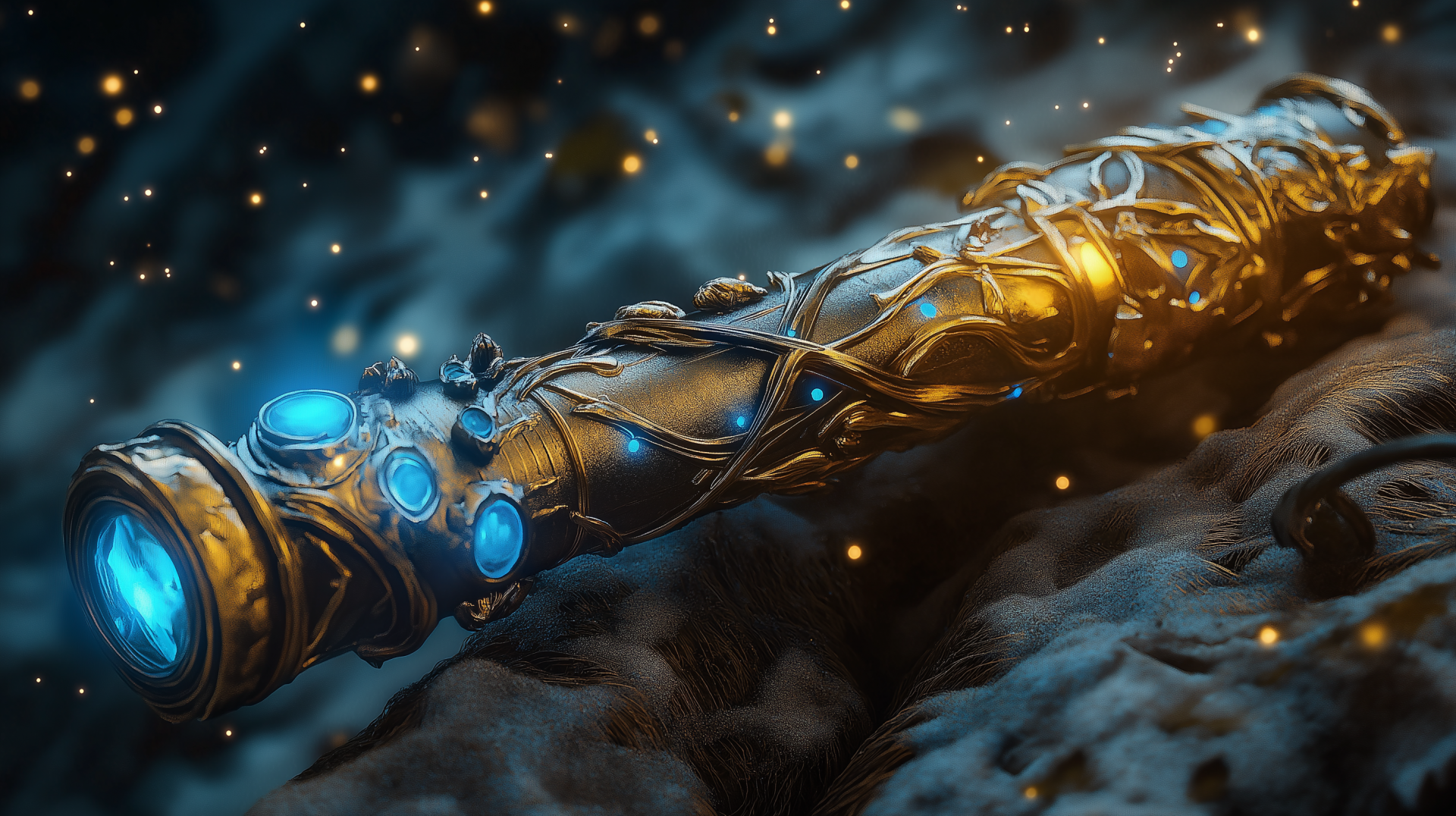 The image depicts a stunningly detailed magical weapon, glowing with intricate designs and vibrant colors. Its dynamic lighting creates an awe-inspiring atmosphere, emphasizing the realism and craftsmanship of the piece.