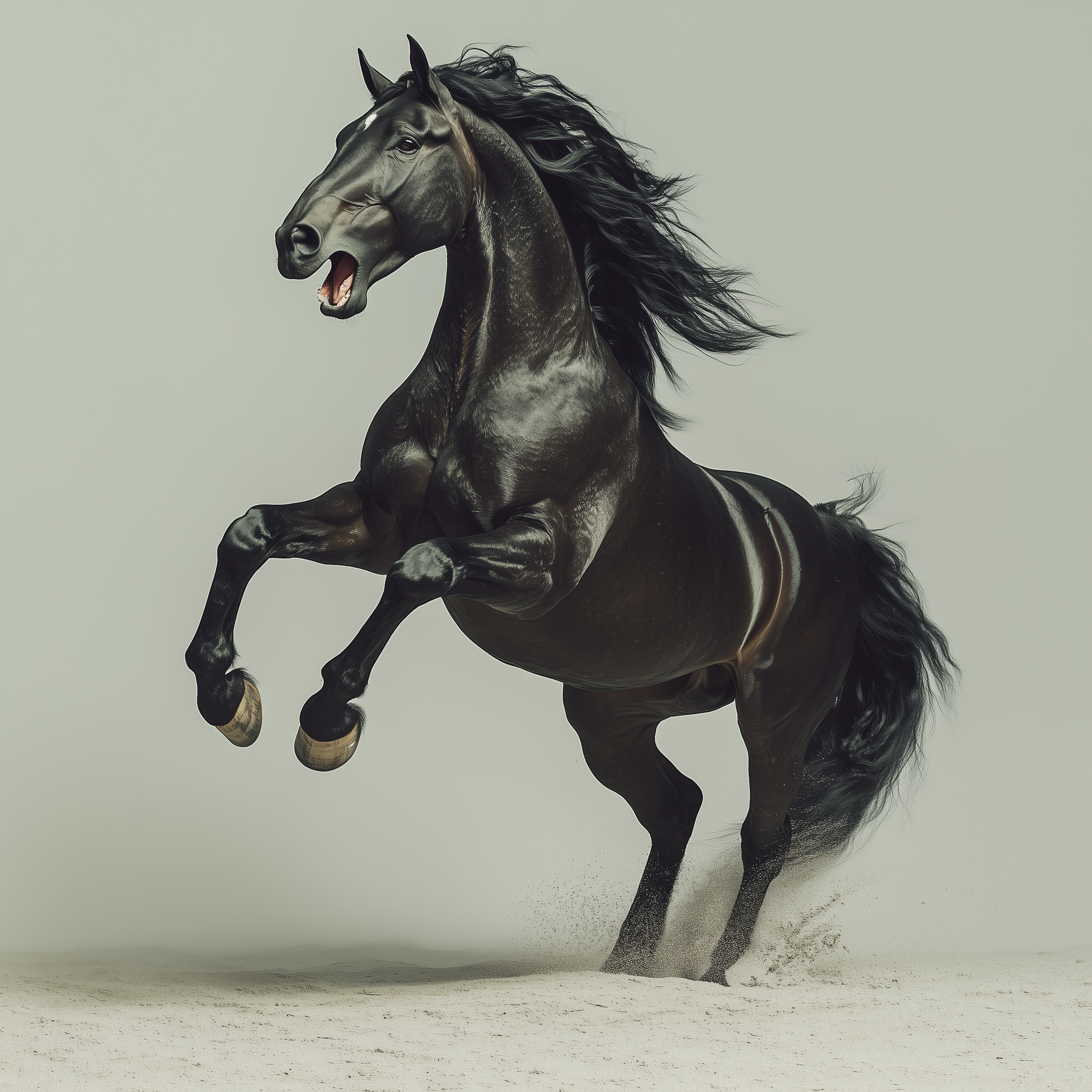 This photograph showcases a powerful fantasy horse in a dramatic pose. The horse rears up with an intense expression, creating a sense of movement and energy in the low light.