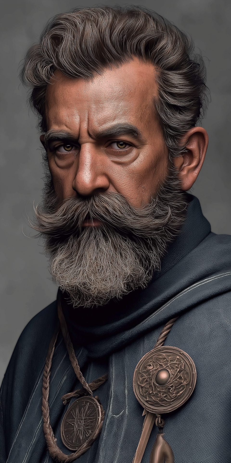 The image features a full-body portrait of a high fantasy sorcerer captured in a dynamic pose. With a focus on realistic anatomy and intricate details, the character stands against a richly detailed dungeon background, enhanced by cinematic shadows and lights.