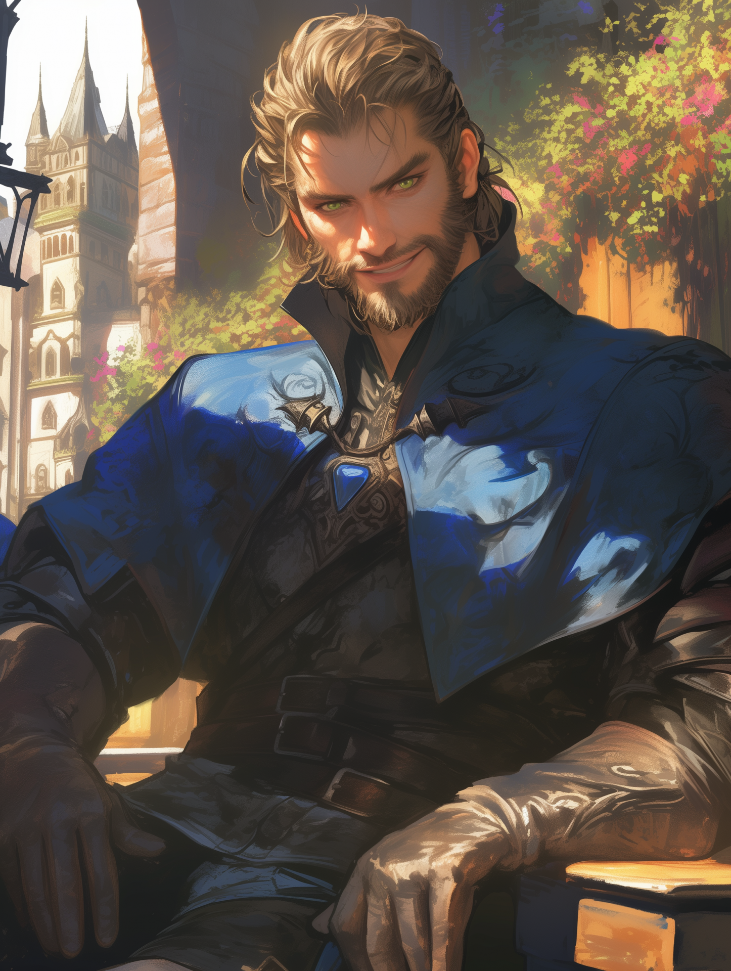 A handsome young man with striking green eyes and a black beard stands in a vibrant, fantasy street landscape. He is smiling in a full body shot, exuding a magical and inviting aura.