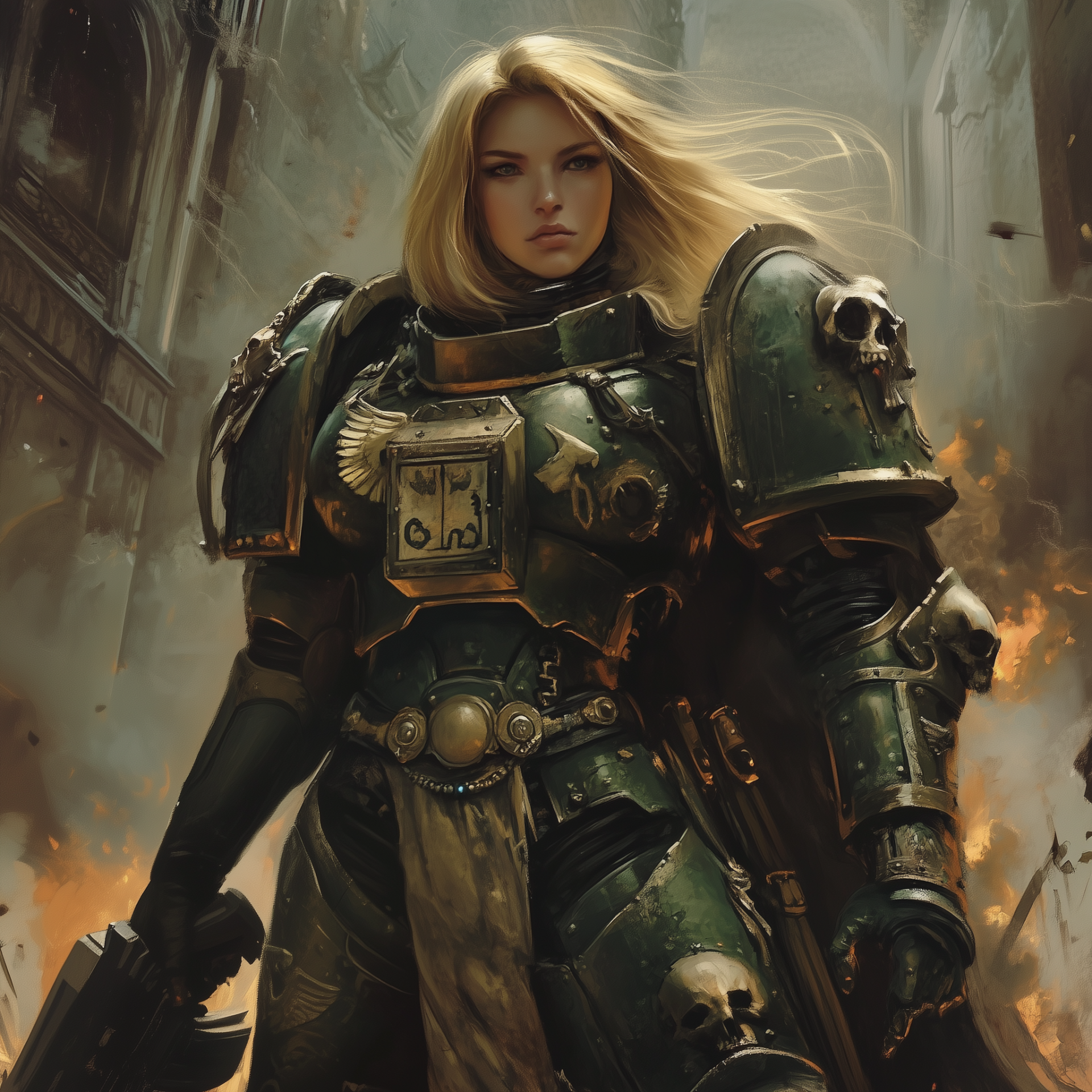 This illustration features a fierce warrior clad in ornate armor, reminiscent of a fantasy world infused with magical elements. The artistic style blends the grandeur of epic battles with intricate details, embodying a powerful presence.