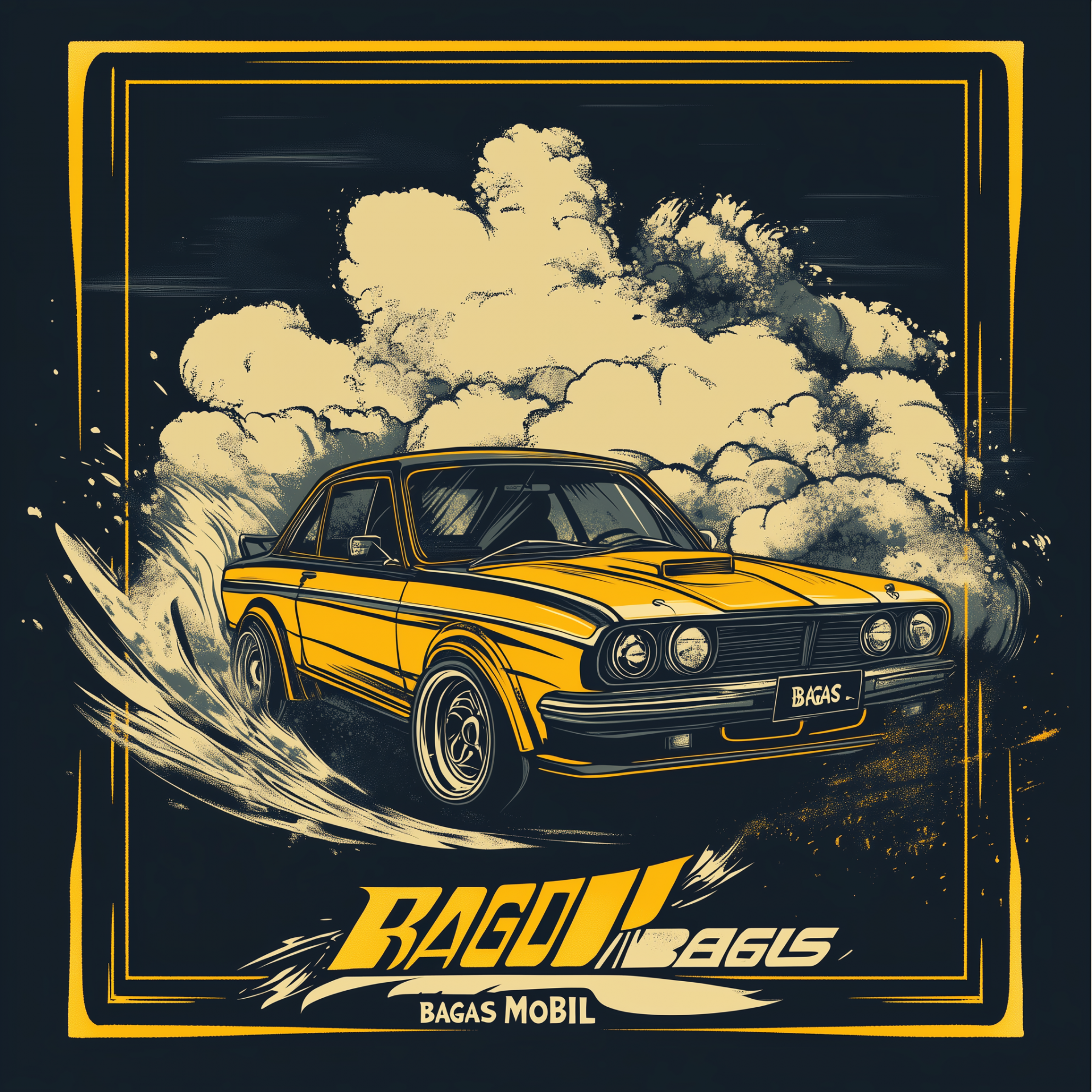 This illustration features the text 'BAGUS BAGAS MOBIL' prominently displayed within a 9:16 square frame. The design includes stylish accents that evoke a sense of motion and automotive elegance, creating an appealing visual impact.