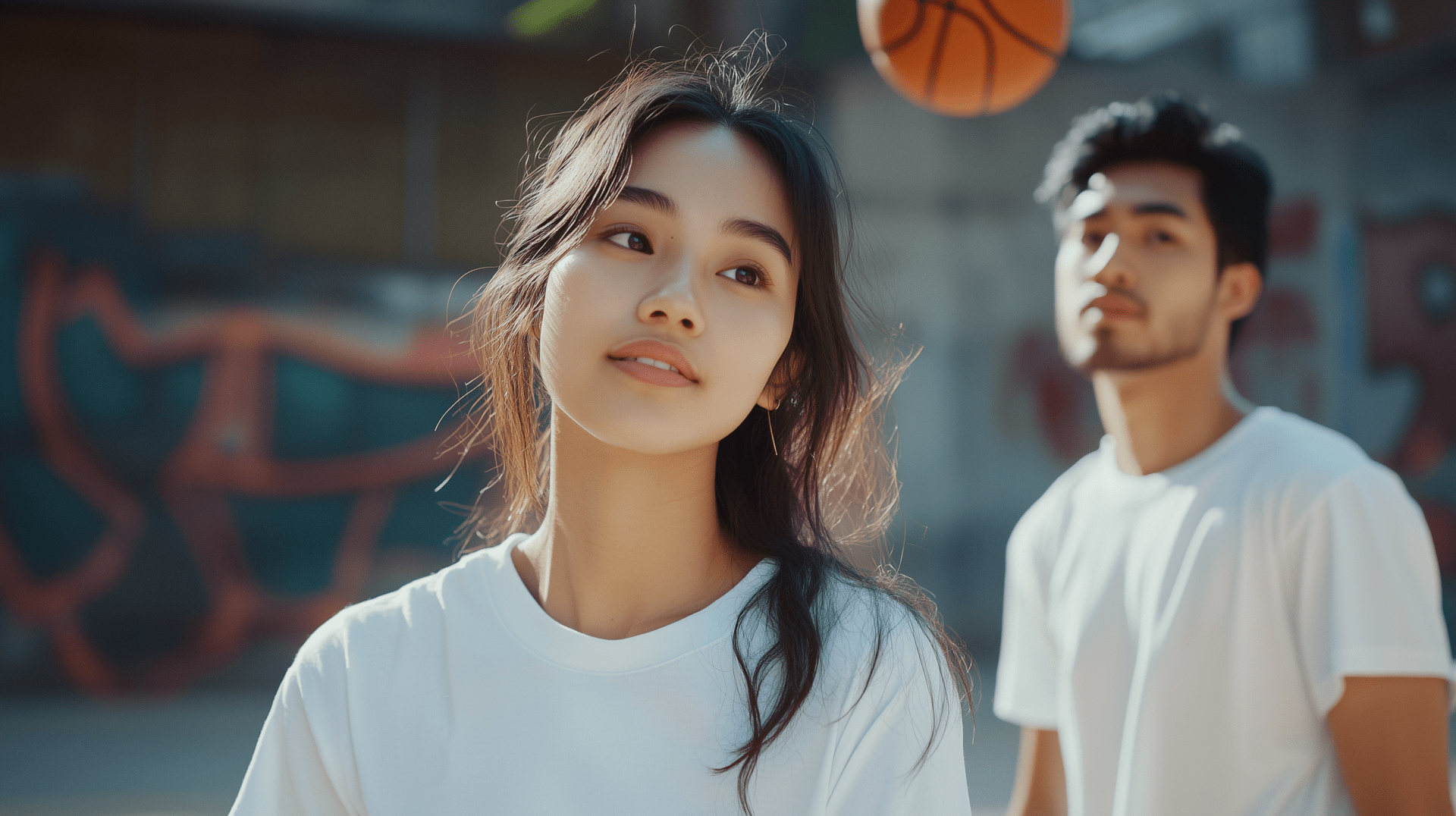 The image features a stylish group of Asian individuals dressed in crisp white t-shirts, exuding a sense of confidence and trendiness. Their clothing and demeanor reflect contemporary fashion, showcasing a vibrant and dynamic atmosphere.